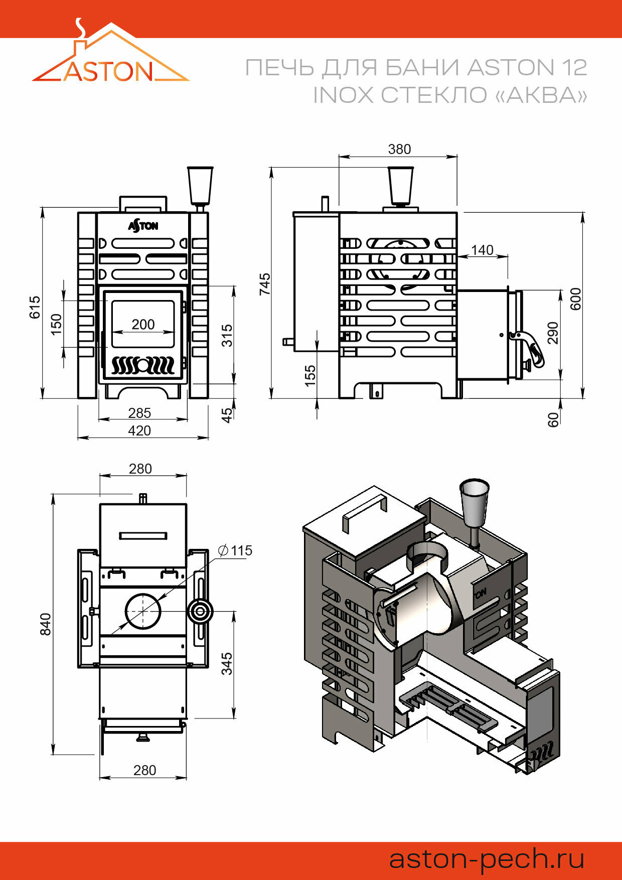 Печь для бани ASTON 20 INOX дверка со стеклом диаметр дымохода: 115 мм