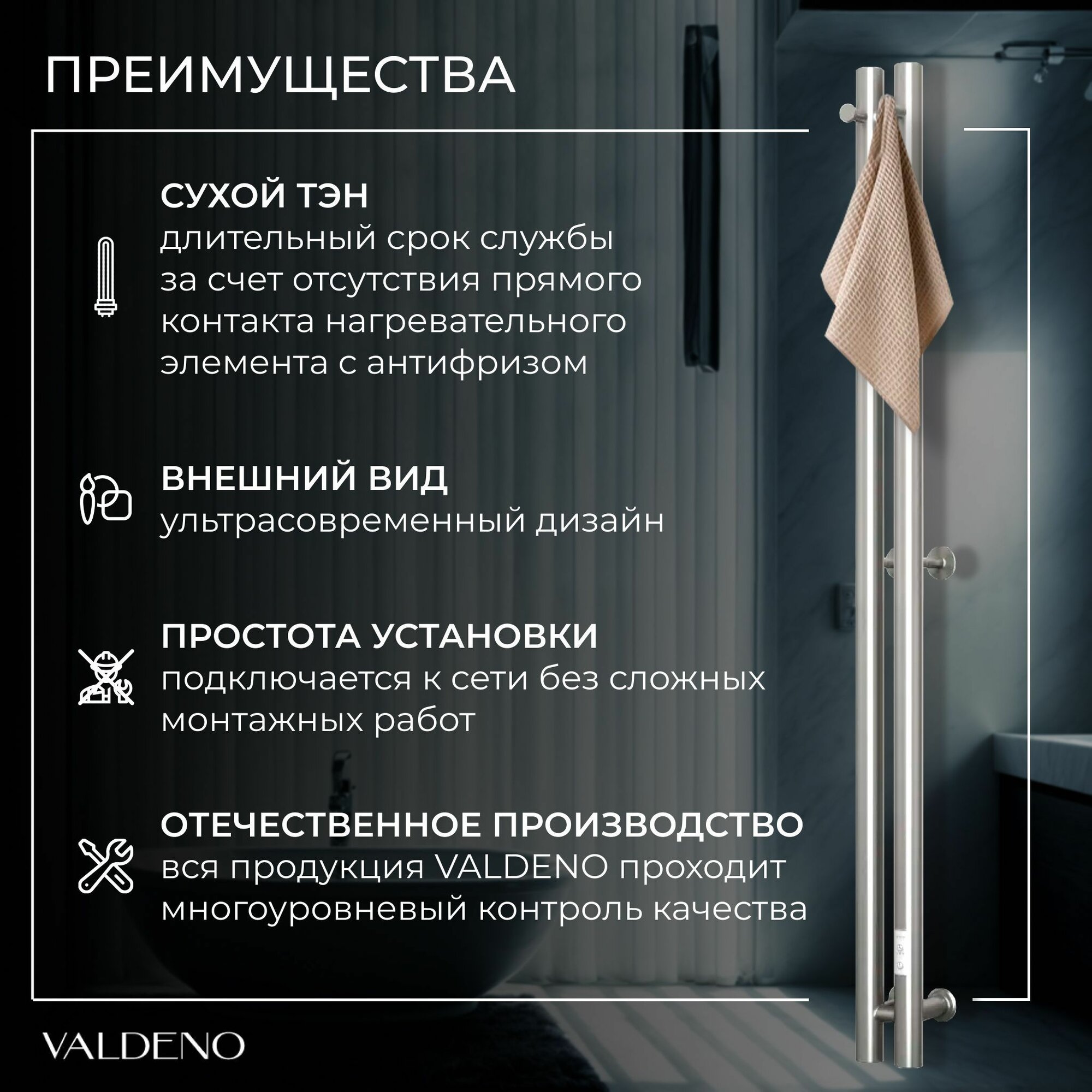 Полотенцесушитель 1200: 2 секции, Электрический, сухой ТЭН, 2 крючка (Хром) интересное: