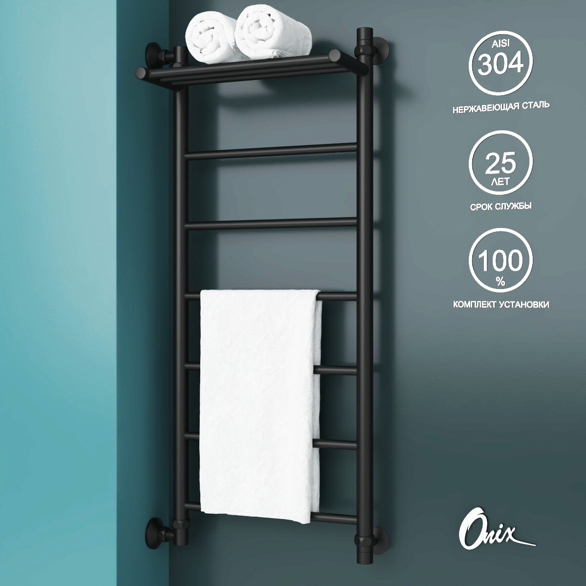 Полотенцесушитель Водяной Onix, модель Classic Plus Black 500x1000 Лесенка с нижним подключением, черный матовый, полный комплект