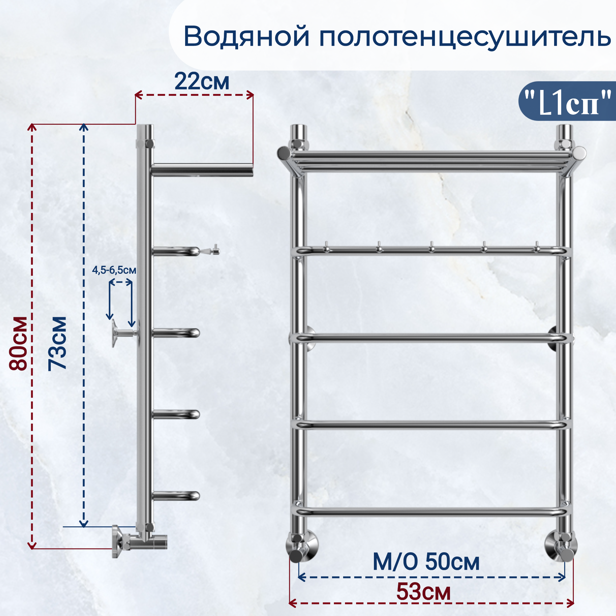 Водяной полотенцесушитель юрма модель L1сп размер 60*50сm нижнее подключение 1* наружная резьба с полкой и крючками