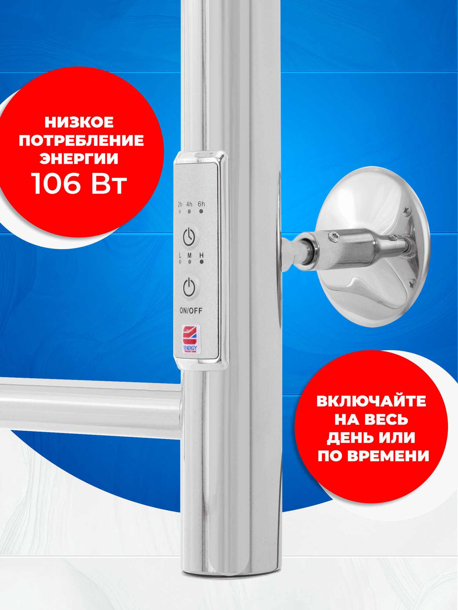 Полотенцесушитель электрический Energy ROUND 900x400 хром, с терморегулятором и таймером, полированная нержавеющая сталь