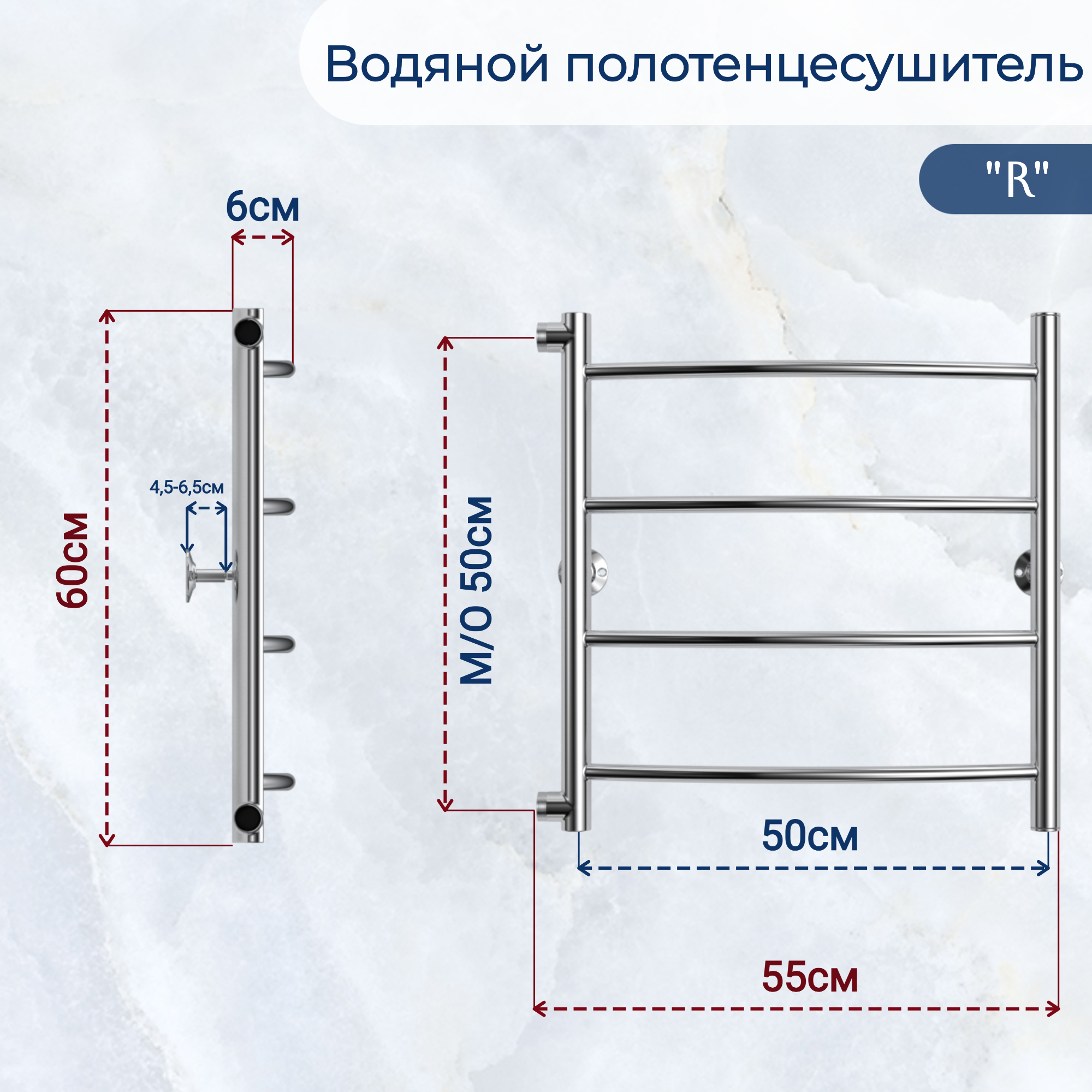 Водяной полотенцесушитель "юрма" модель "R" 80/50/50см боковое подключение универсальное справа/слева