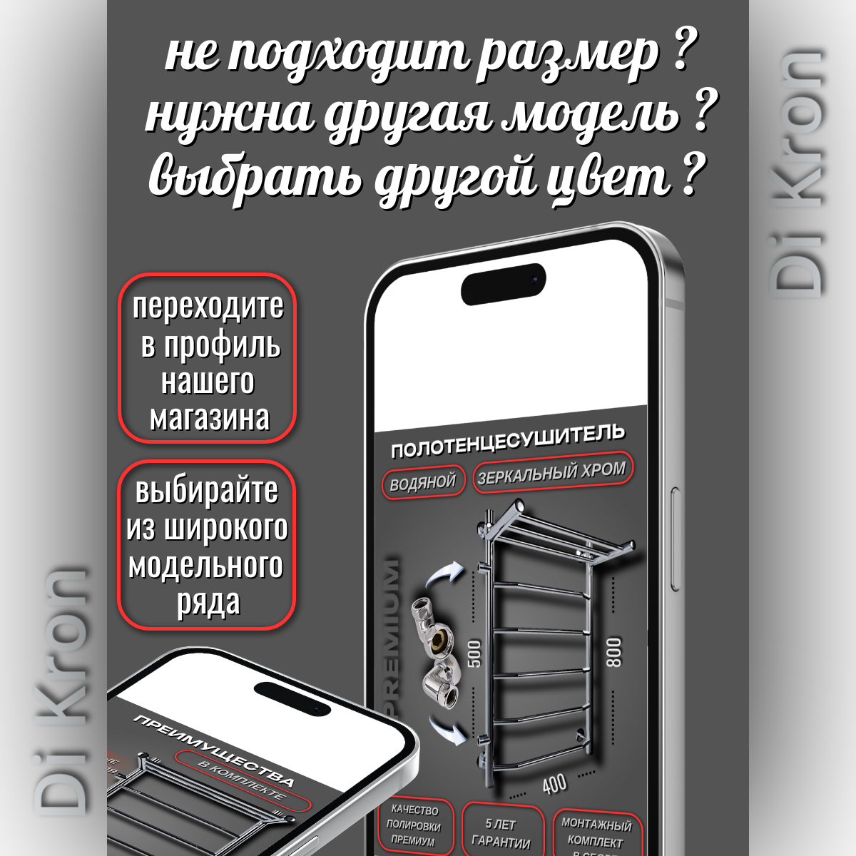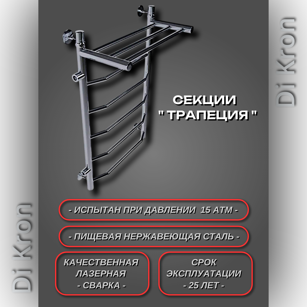 Полотенцесушитель Водяной узкий с полкой Di Kron, модель Premium-T 800х400 боковое подключение 50 см слева угловое интересное: