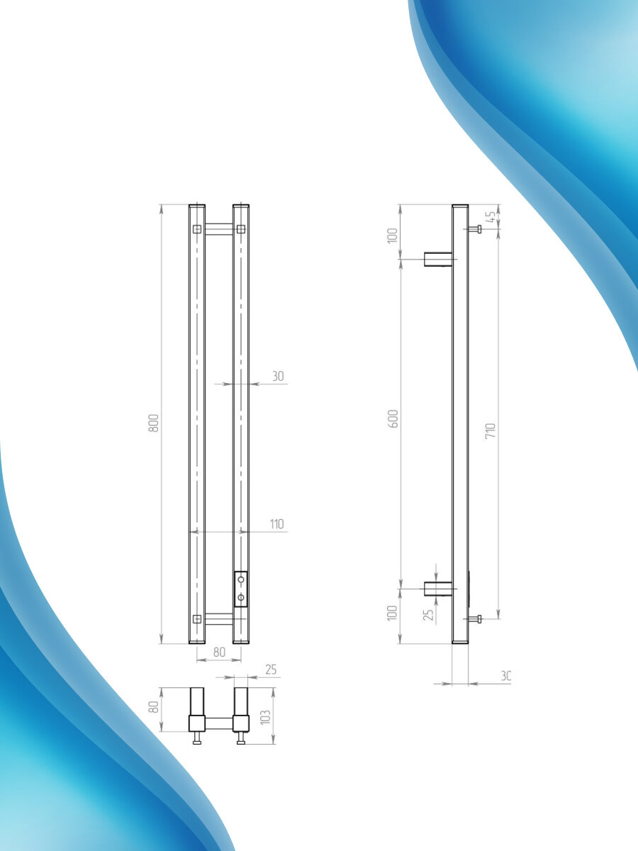 Полотенцесушитель дизайнерский электрический, профильный BAU Stella 8х80, 2 коллектора, 3 крючка (Белый DB-0071)