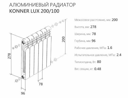 Радиатор Konner LUX 100/200 10 секций боковое подключение алюминий белый интересное: