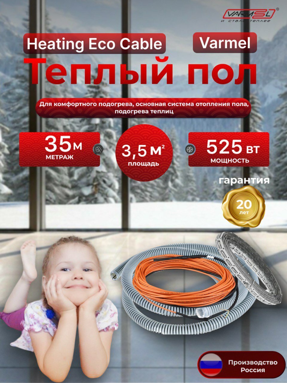 Тёплый пол электрический Varmel Heating Eco Cable / 35 м - 525 Вт / Греющий кабель 150 Вт. м2