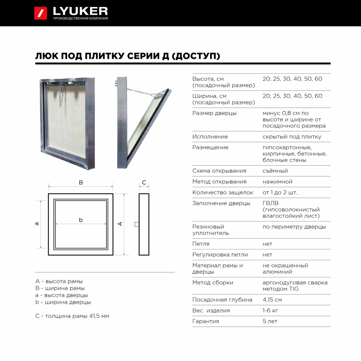 Люк под плитку (В/Ш) 50/50, съёмный, LYUKER, серия "Д", алюминиевый, с цепочкой и карабином