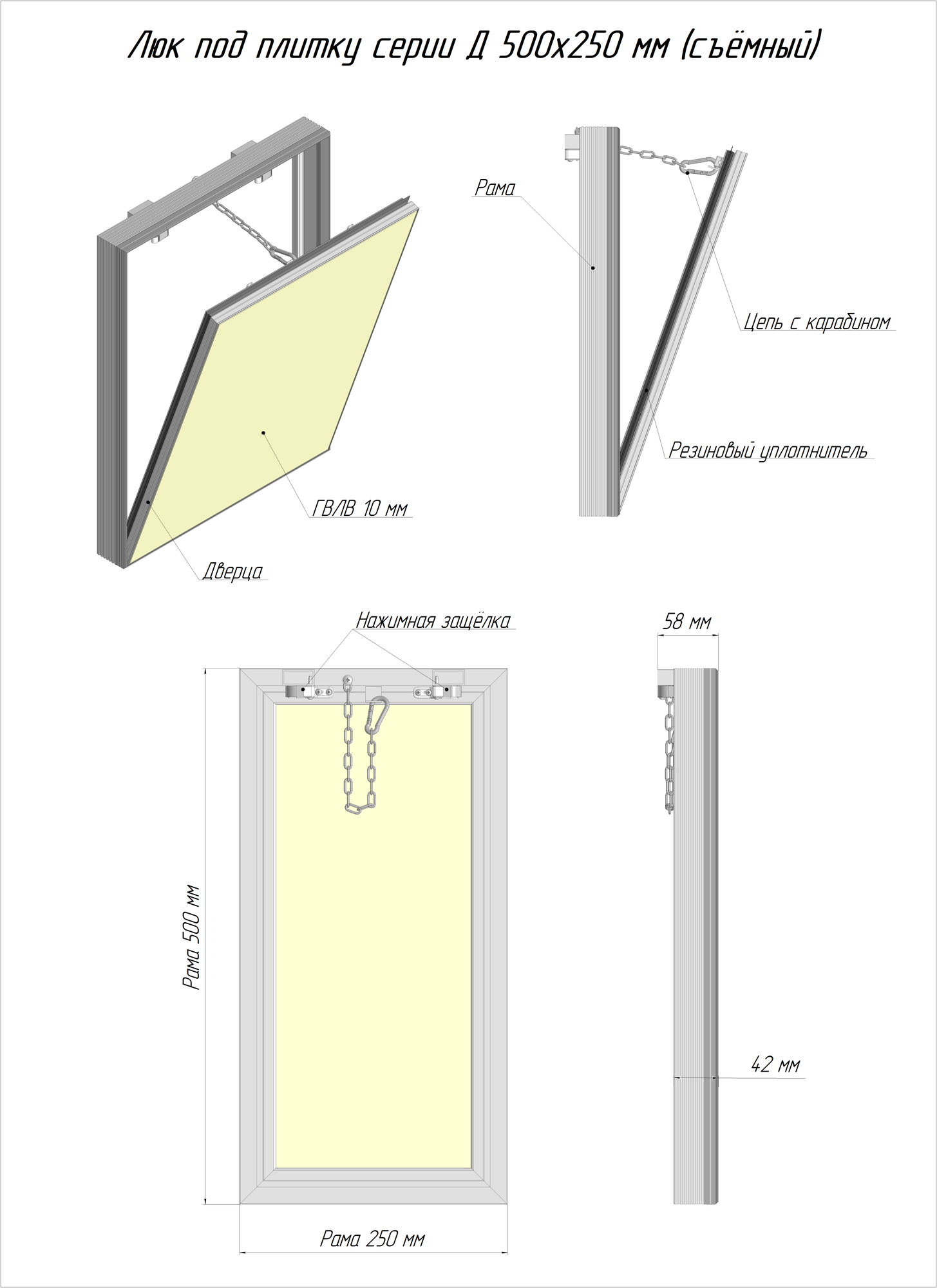 Люк под плитку (В/Ш) 50/50, съёмный, LYUKER, серия "Д", алюминиевый, с цепочкой и карабином