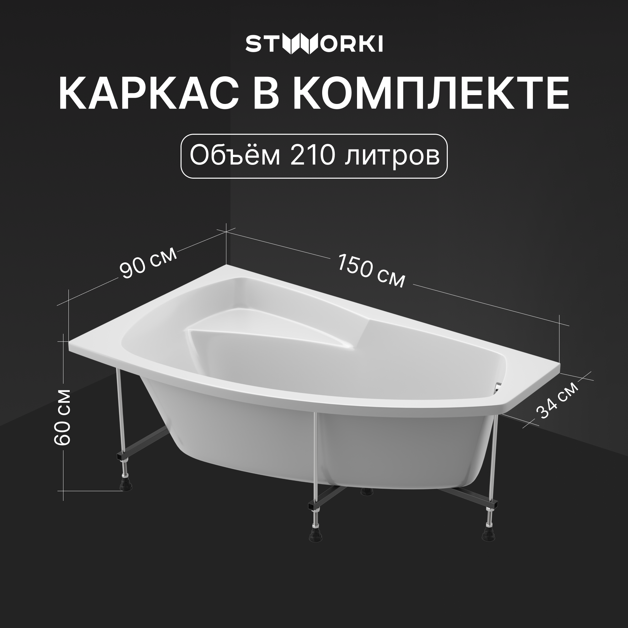 Акриловая ванна STWORKI Монтре R 160x95 см, угловая, правая, пристенная, белая, асимметричная, с каркасом, с сиденьем