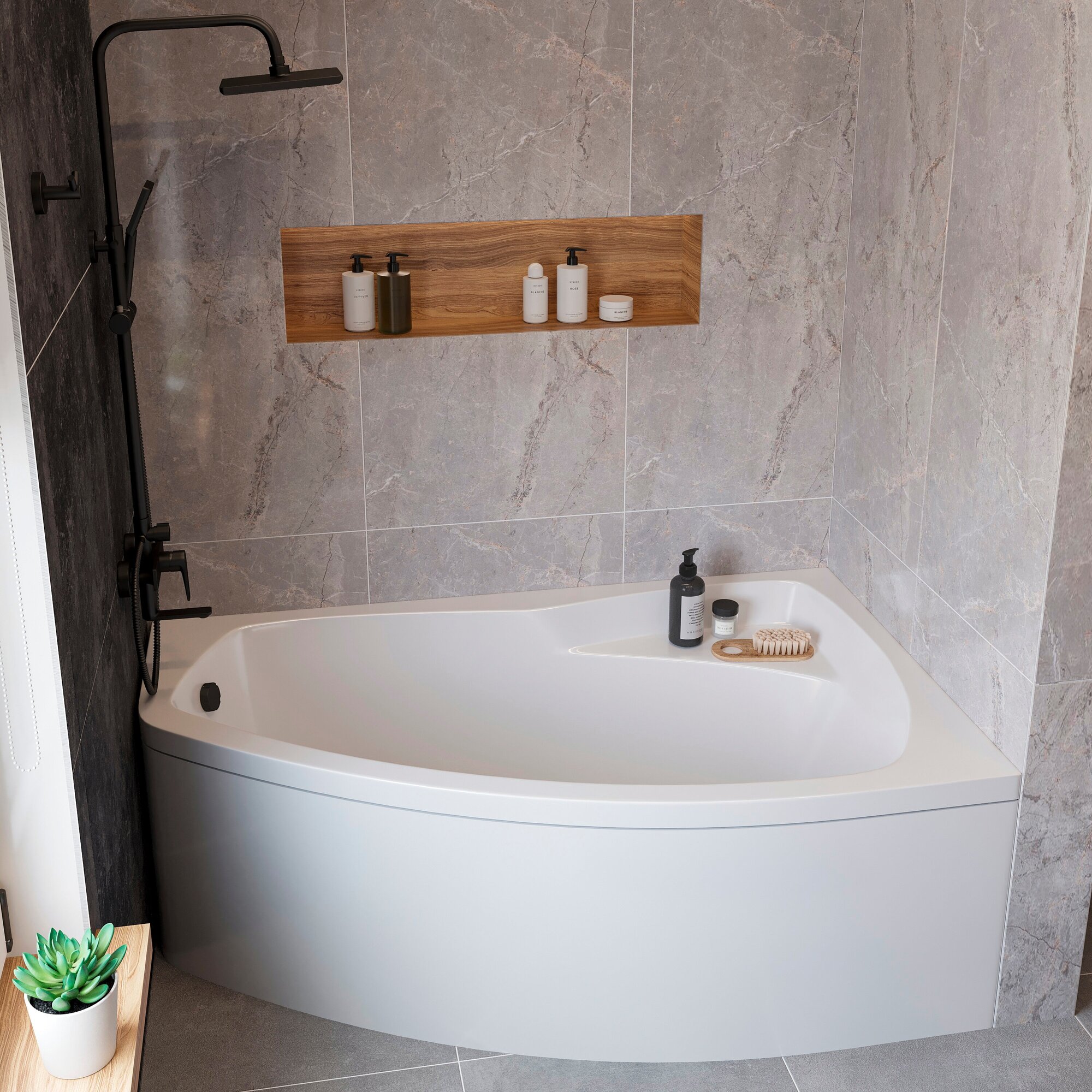 Акриловая ванна STWORKI Монтре L 170x105 см, угловая, левая, пристенная, белая, асимметричная, с каркасом, с сиденьем