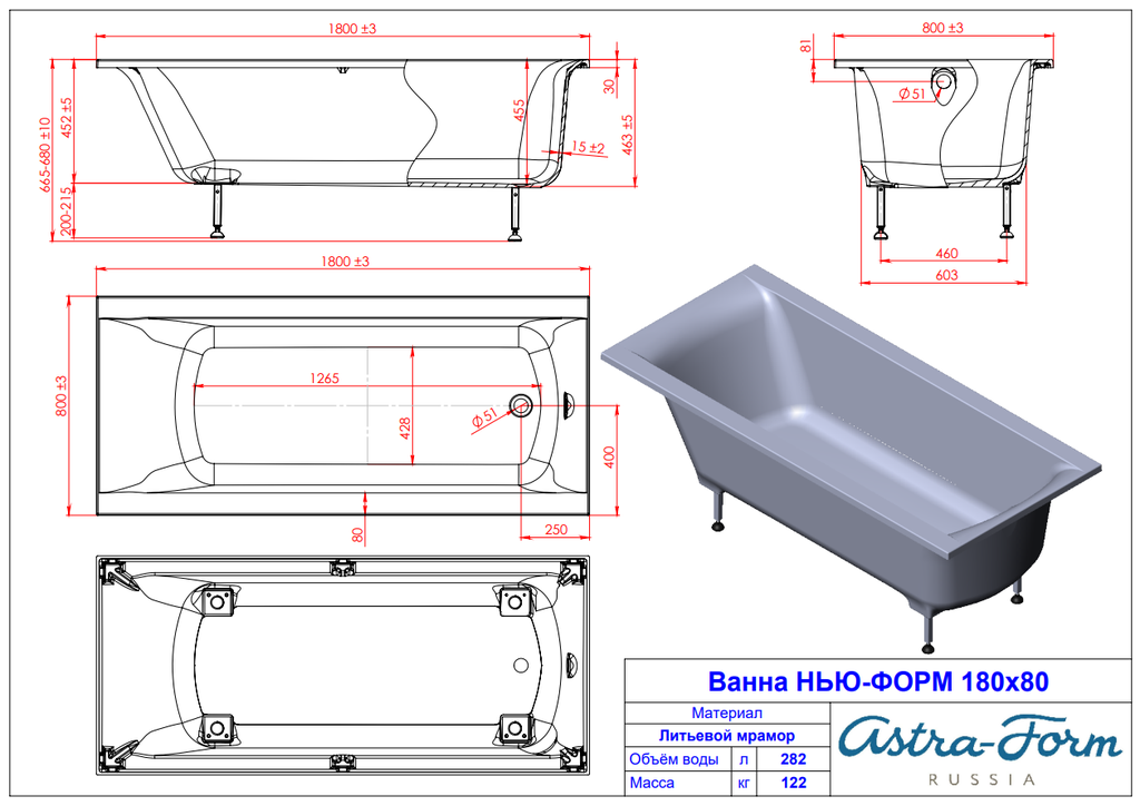 Ванна Astra-Form "Нью-Форм", искусственный камень, белая, 180x80 см интересное: