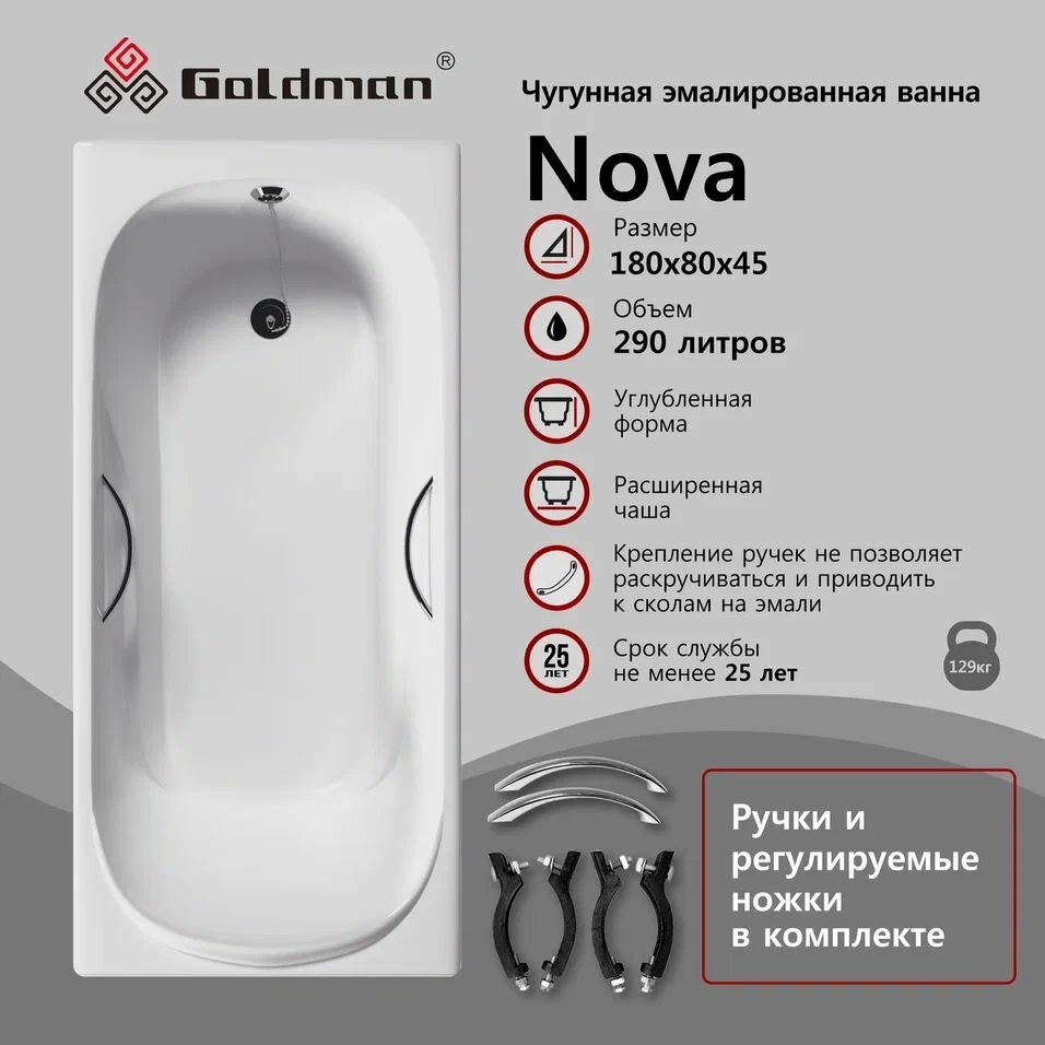 Купить Чугунная ванна Goldman Nova 180x80x45 с дугообразными хромированными ручками