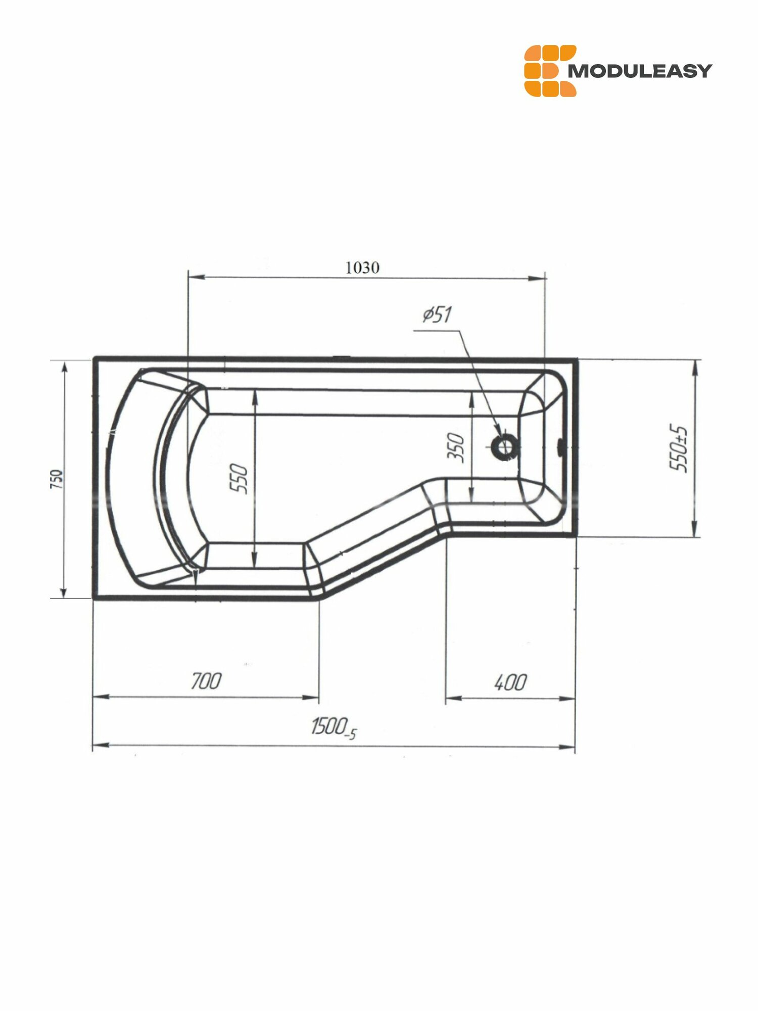 Ванна акриловая 150х75 см INFORM Асимметричная правый угол, 100% сантехнический акрил, MODULEASY 01инф1575п