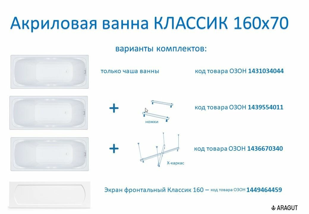 Купить Акриловая ванна ARAGUT Классик 160х70 прямоугольная, в комплекте с каркасом, белая