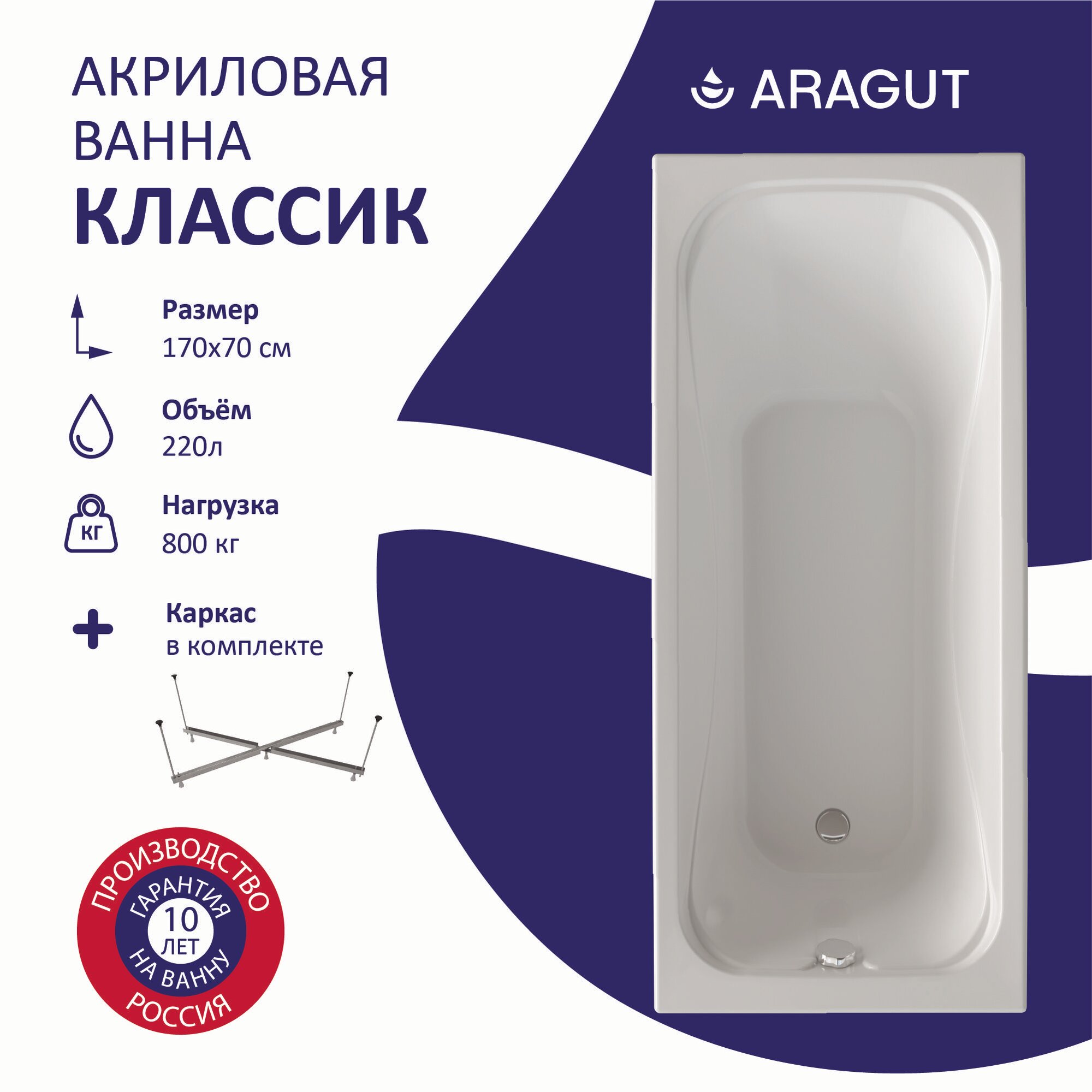 Купить Акриловая ванна ARAGUT Классик 170х70 в комплекте с каркасом, прямоугольная, белая