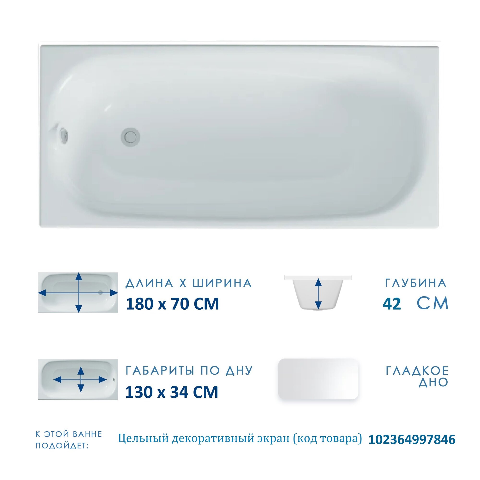 Ванна акриловая 1ACReal Европа 180х70 см, (комплектация: ванна, каркас, экран лицевой, слив-перелив полуавтомат)