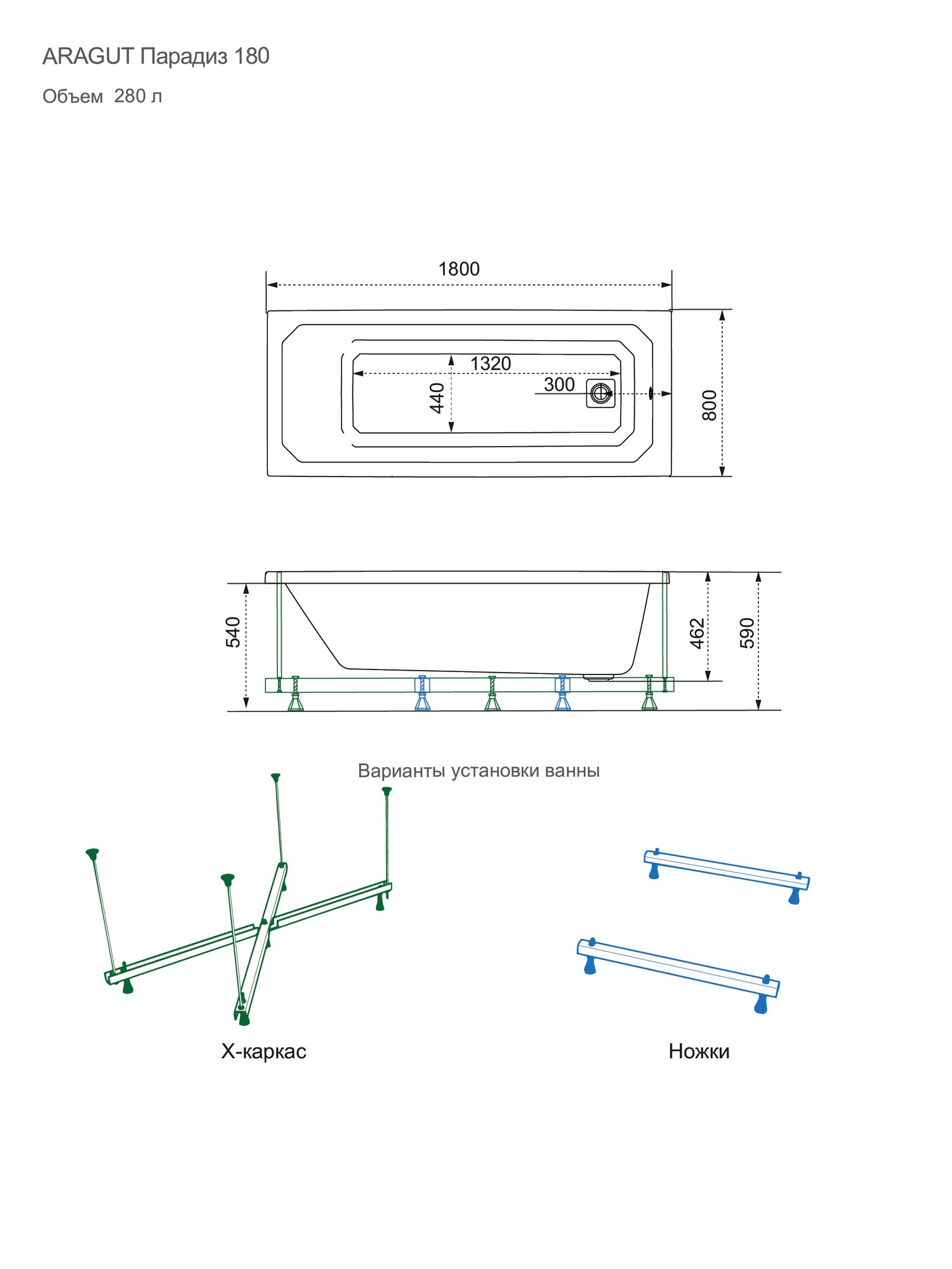 Купить Акриловая ванна ARAGUT Парадиз 180х80 прямоугольная, в комплекте с ножками, белая
