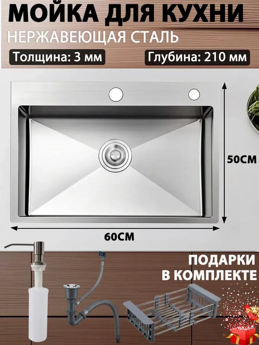 Мойка для кухни из нержавеющей стали 50*45см . Кухонная раковина, дозатор для мыла, решетка/коландер для овощей