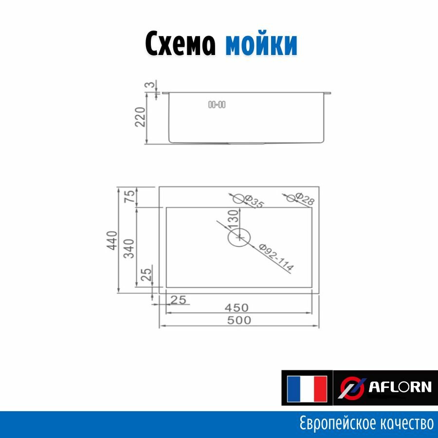 Мойка кухонная AFLORN AF95044, врезная, S=3.0 и 0.8 мм, 50×44×22 см, сифон, сатин