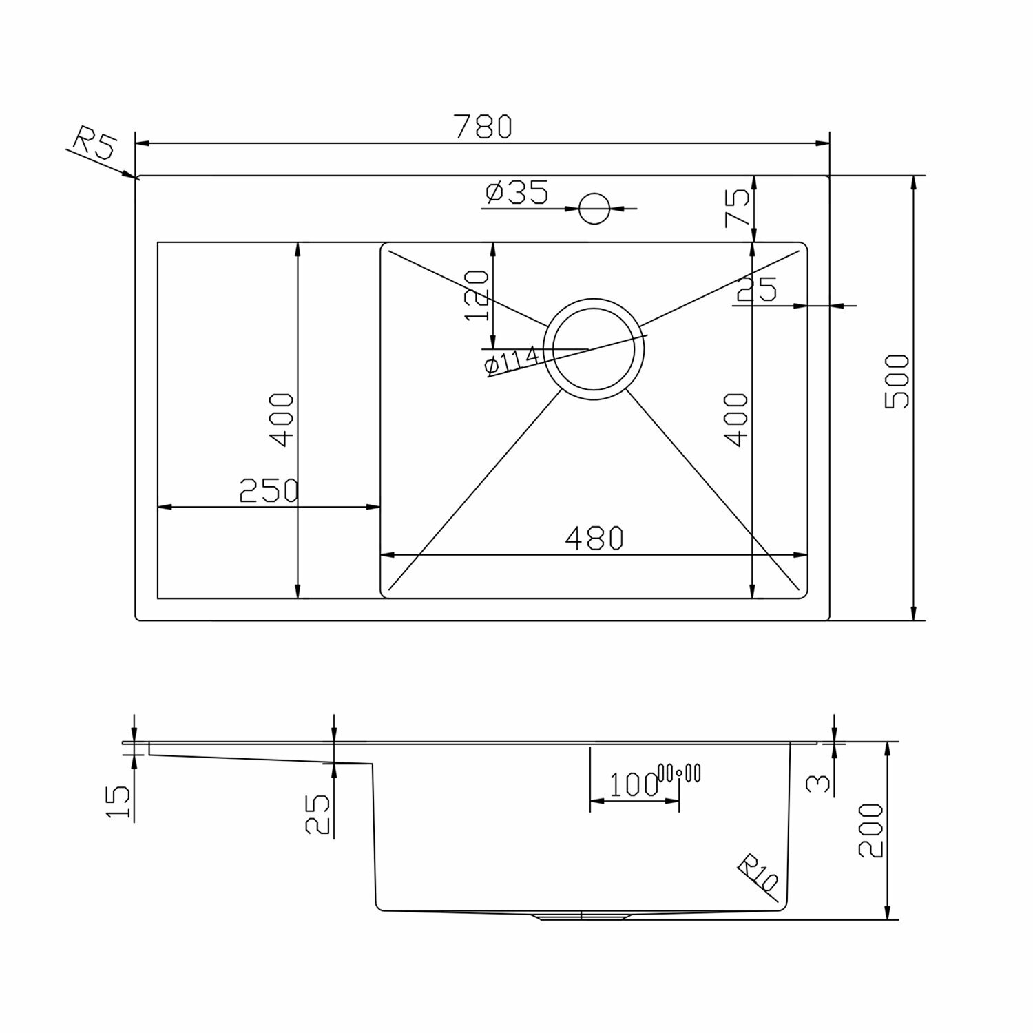 Кухонная мойка 78x50 см, нержавеющая сталь, настольная, левое крыло, цвет бронза, сифон в комплекте