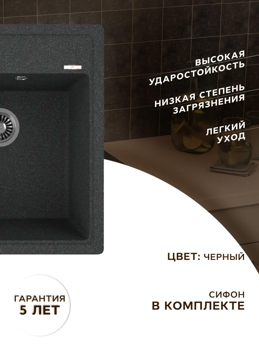 Купить Мойка для кухни врезная кварцевая в комплекте с сифоном BAU Stil Black 46х51, черный