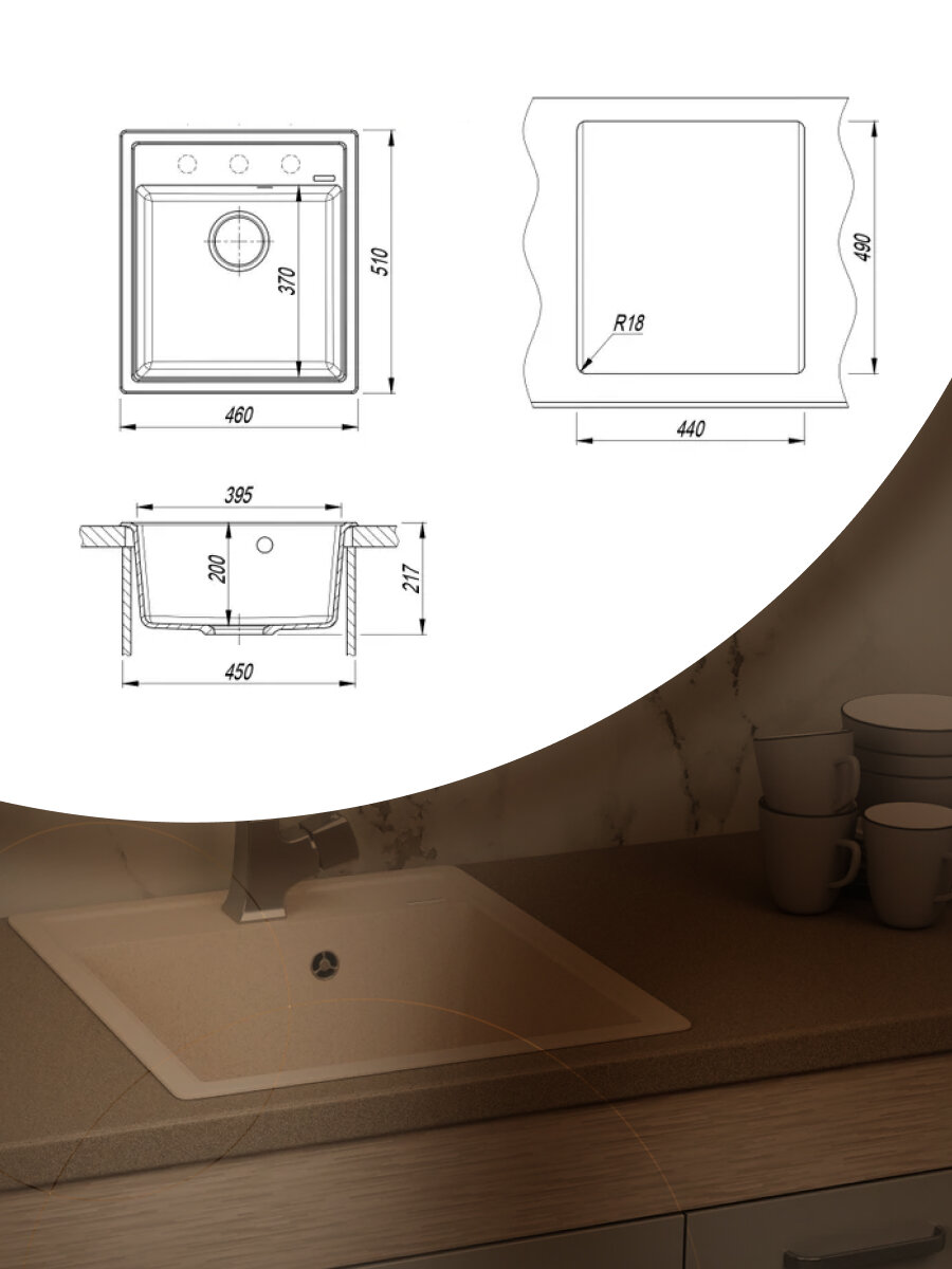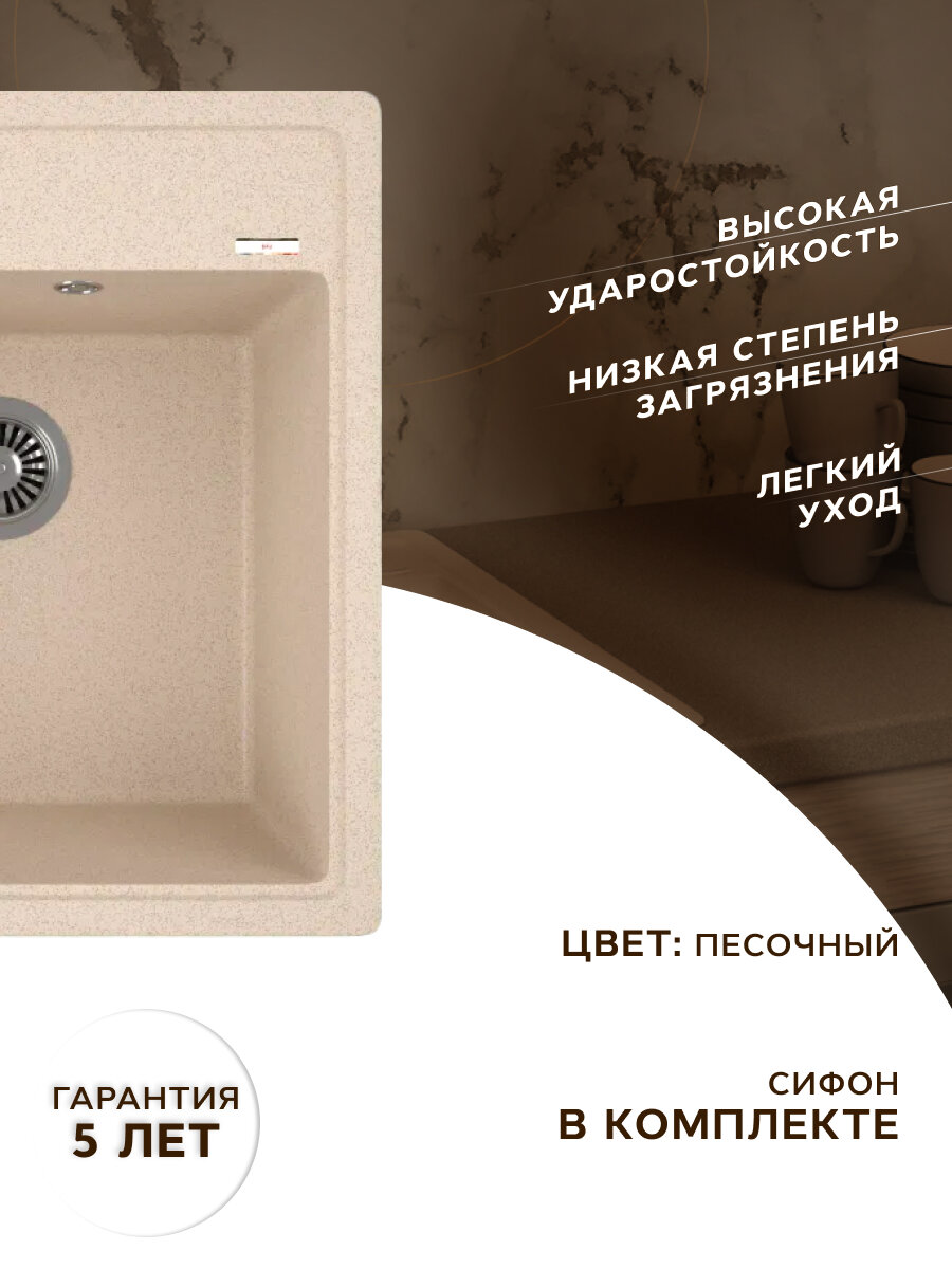 СохранитьМойка для кухни врезная кварцевая в комплекте с сифоном BAU Stil Sand 46х51, песочный интересное: