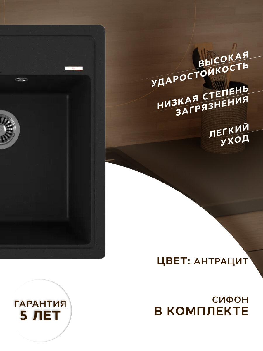 Купить Мойка для кухни врезная кварцевая в комплекте с сифоном BAU Stil Anthracite 46х51, антрацит