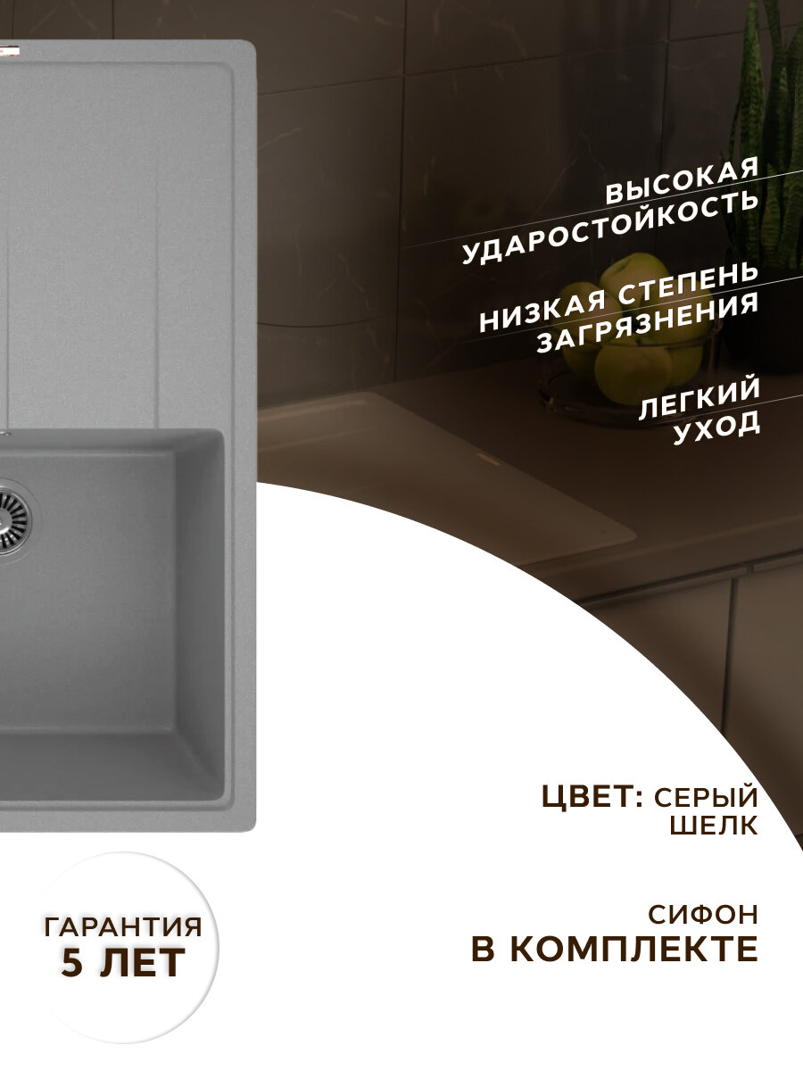 СохранитьМойка для кухни врезная кварцевая в комплекте с сифоном BAU Stil Gray silk 78х51, серый шёлк интересное: