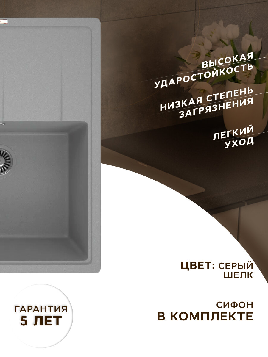Мойка для кухни врезная кварцевая в комплекте с сифоном BAU Stil Gray silk 46х51, серый шёлк