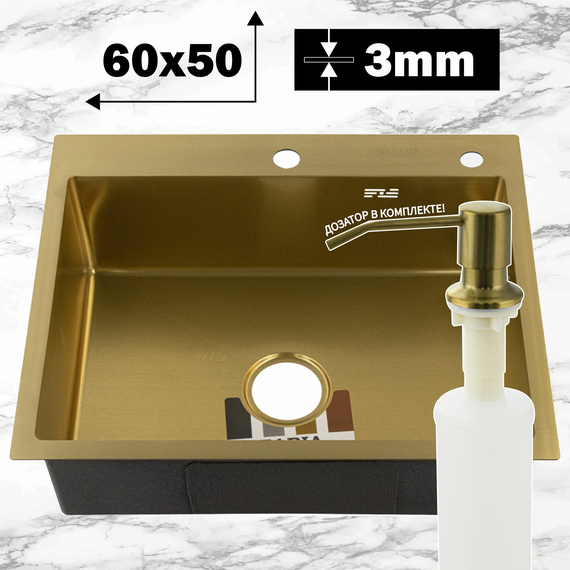 Мойка FABIA Profi 60503 золото врезная для кухни 60х50 см, Раковина из нержавеющей стали с дозатором интересное: