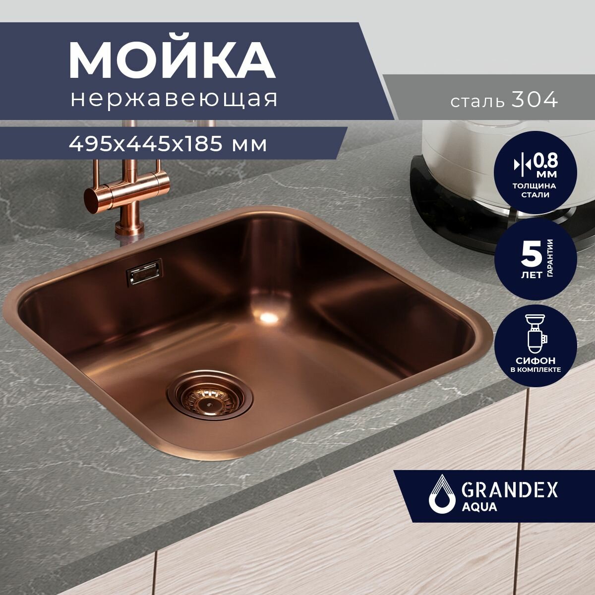 Мойка врезная для кухни нержавеющая сталь с PVD покрытием Grandex Aqua SELECT 49 COPPER, 49,5х44,5х18,5/ Раковина для кухни накладная нержавейка, сифон в комплекте, Турция интересное: