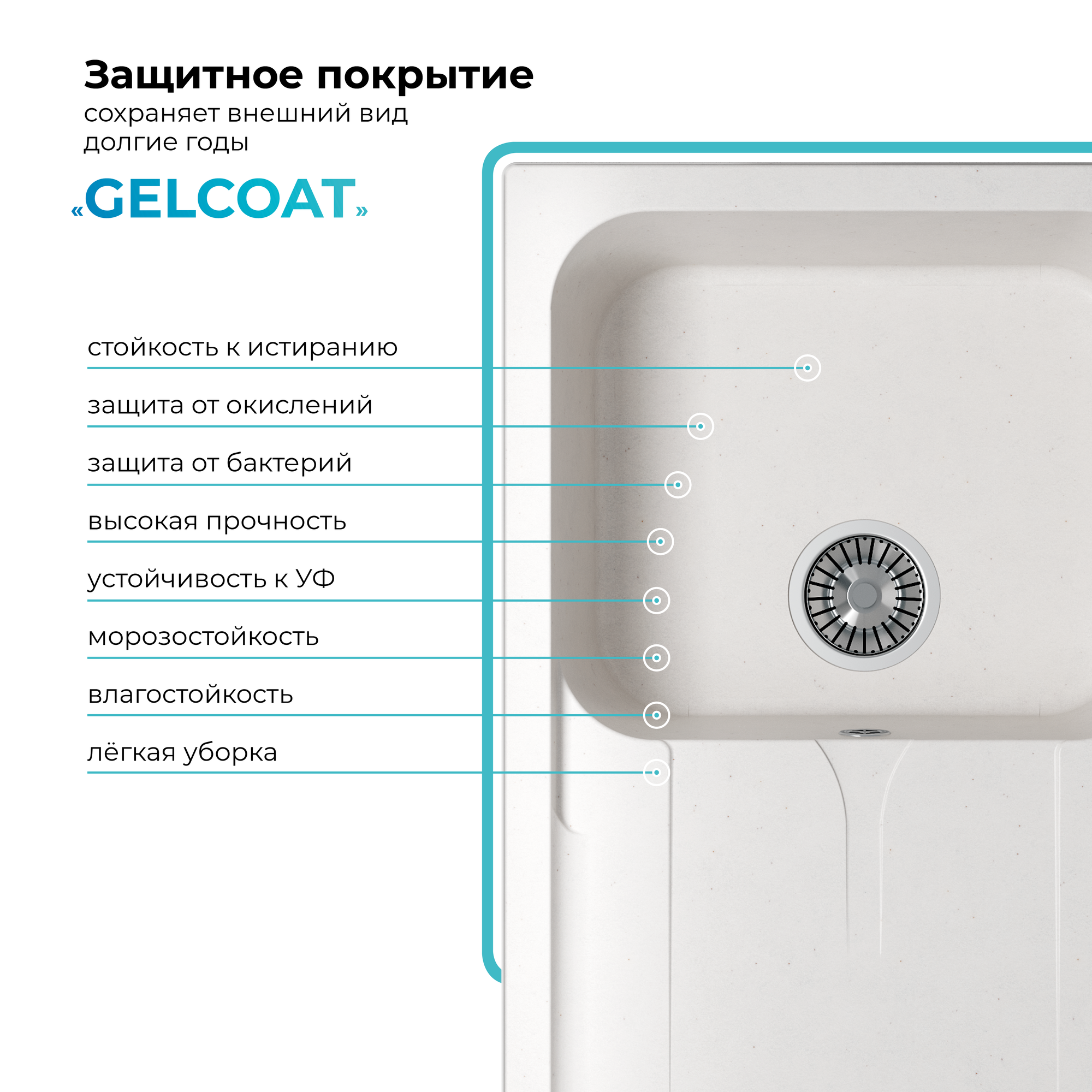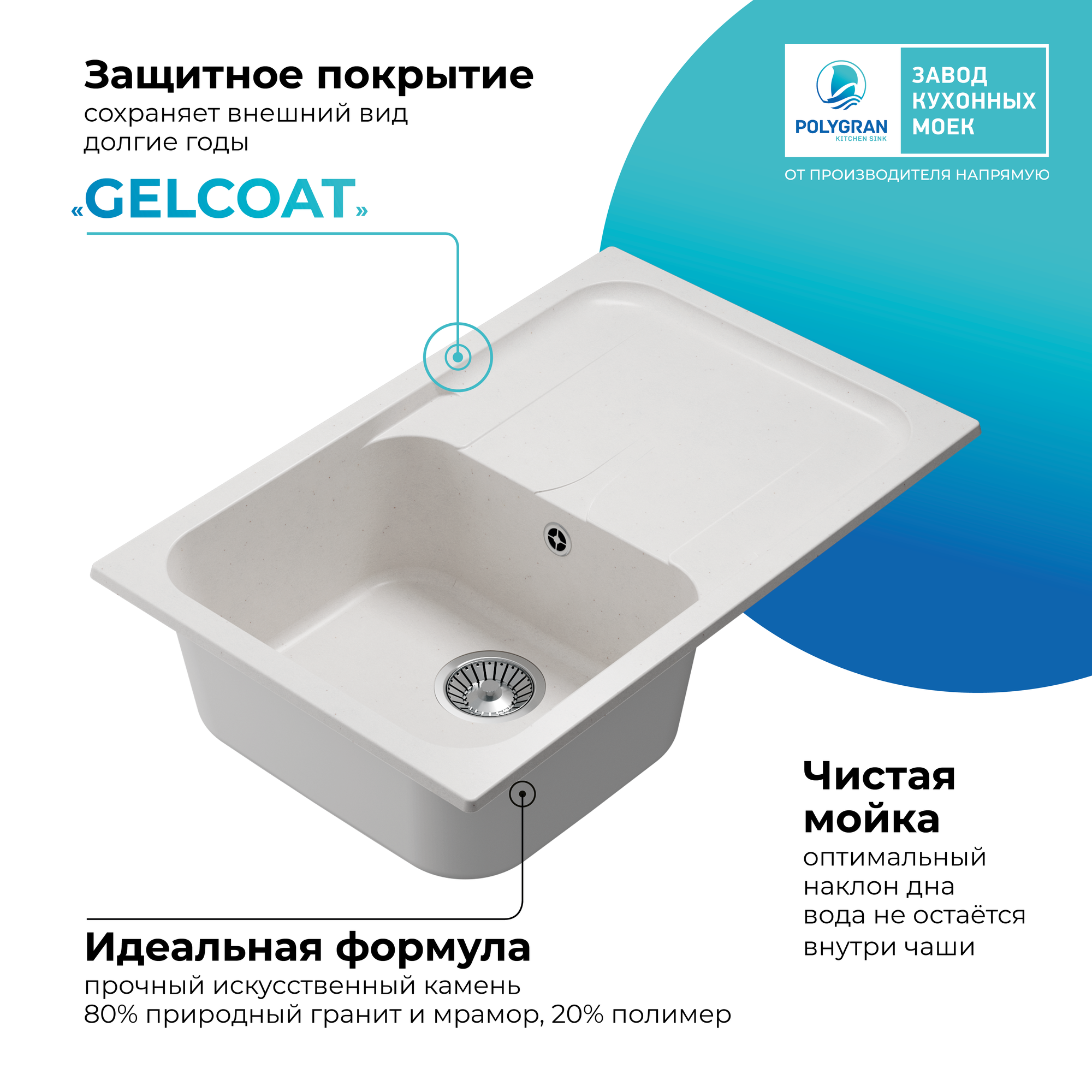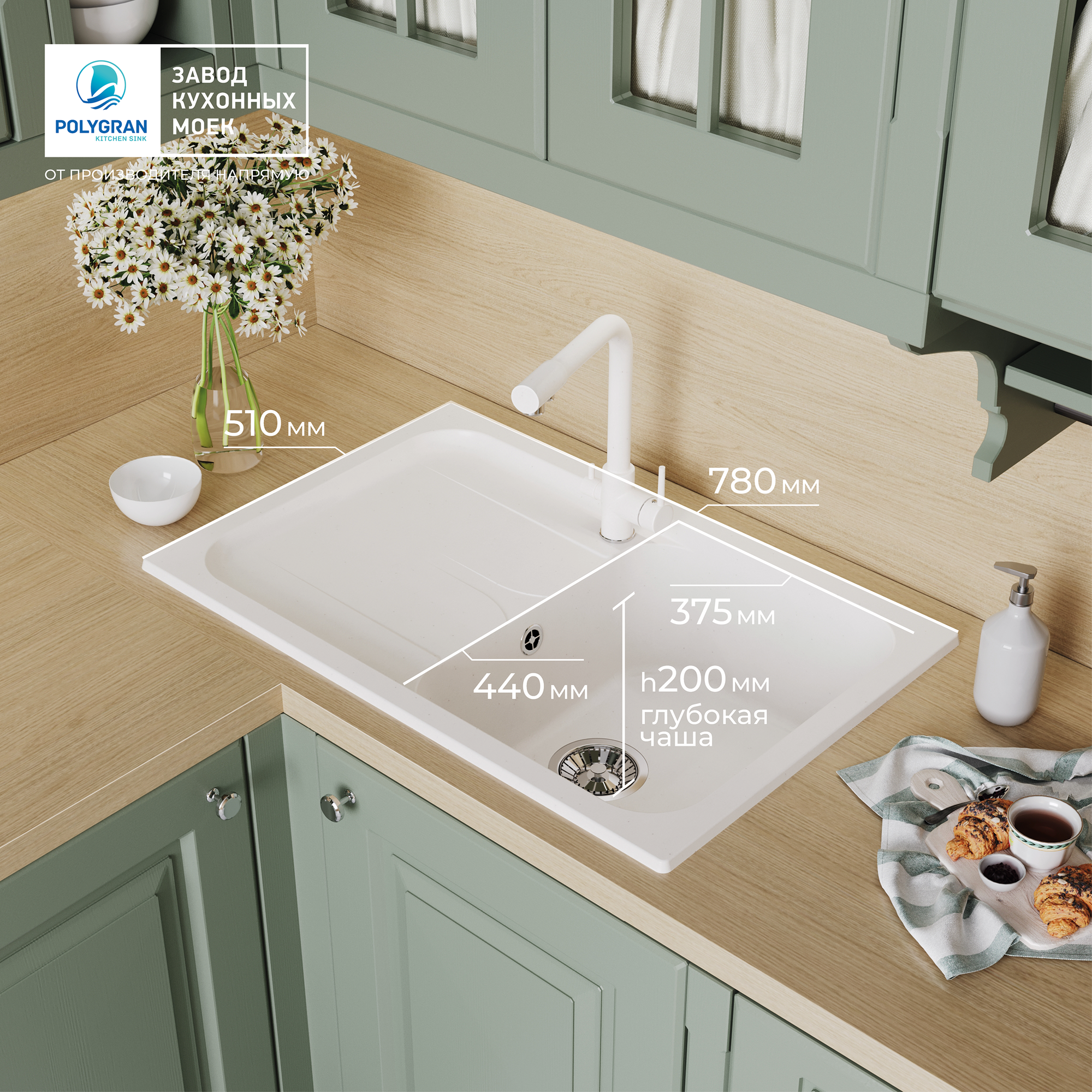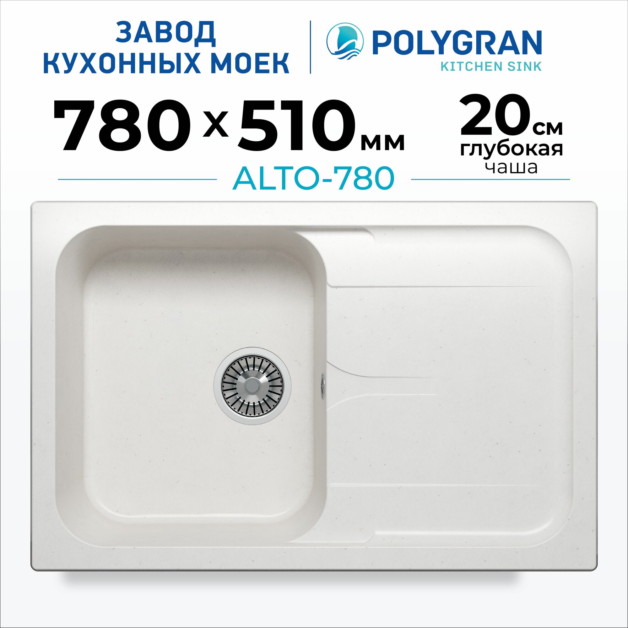 Мойка для кухни каменная POLYGRAN ALTO-780, Белая, Врезная, Квадратная, С крылом (Белый Хлопок) интересное: