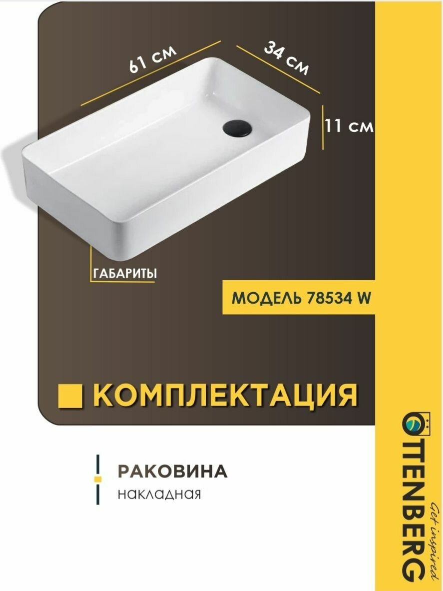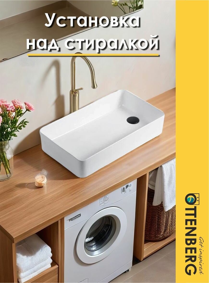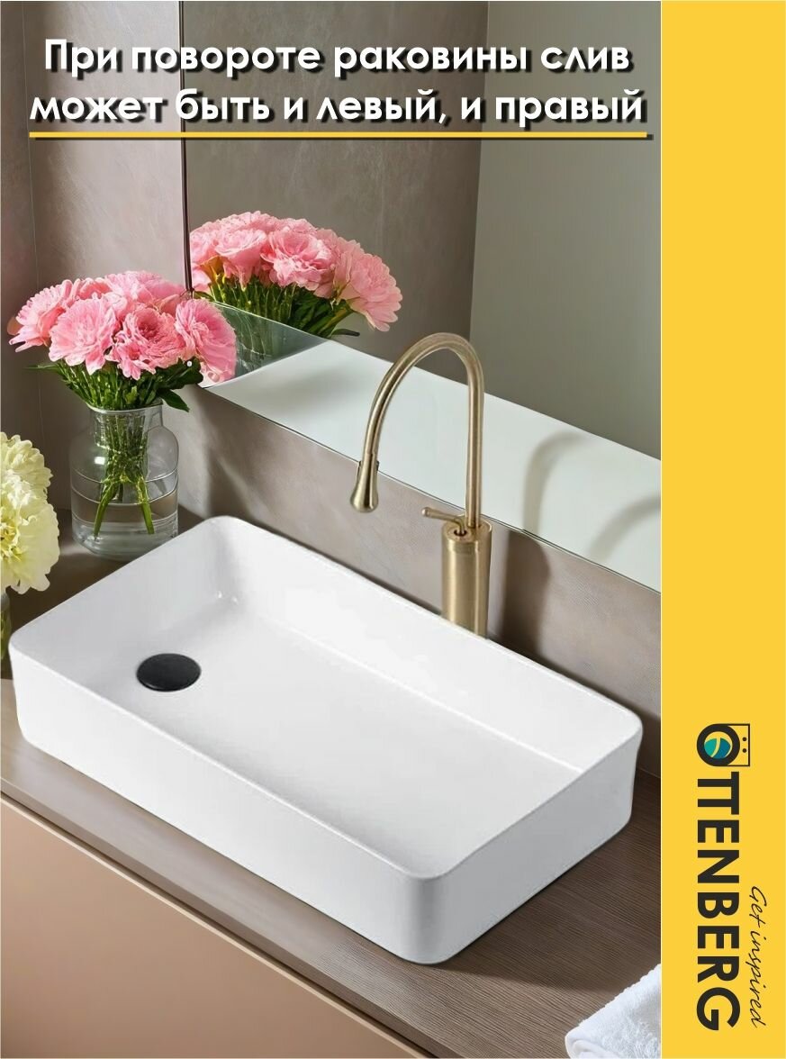 Раковина накладная в ванную со смещенным сливом прямоугольная белая Ottenberg, 61х34х11см интересное:
