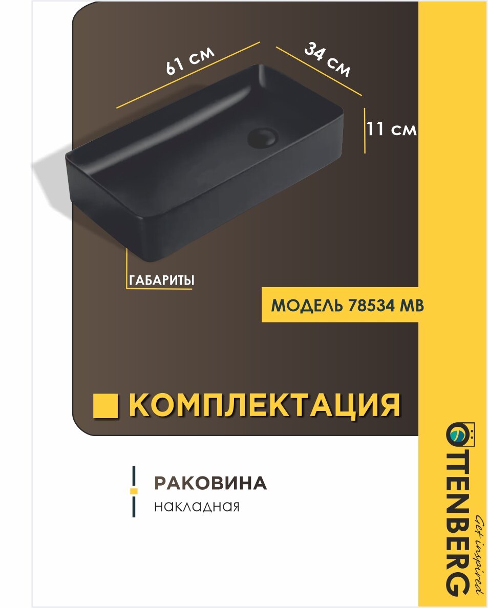 Раковина накладная в ванную со смещенным сливом прямоугольная черная матовая Ottenberg, 61х34х11см интересное: