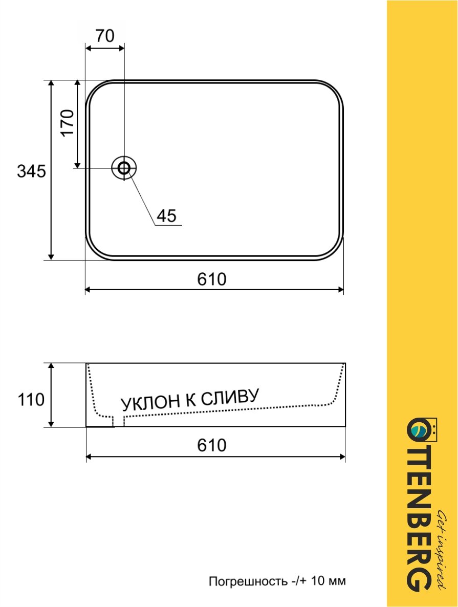 Раковина накладная в ванную со смещенным сливом прямоугольная белая Ottenberg, 61х34х11см