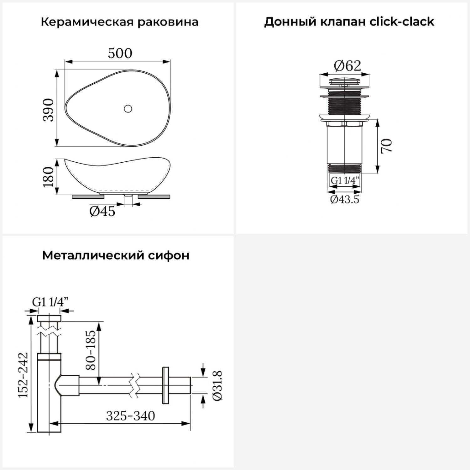 Купить Накладная раковина в ванную комнату Wellsee Nexus Flex 20214023R в наборе 3 в 1: раковина 50 см в цвете белый глянец, донный клапан, сифон (цвет набора хром)