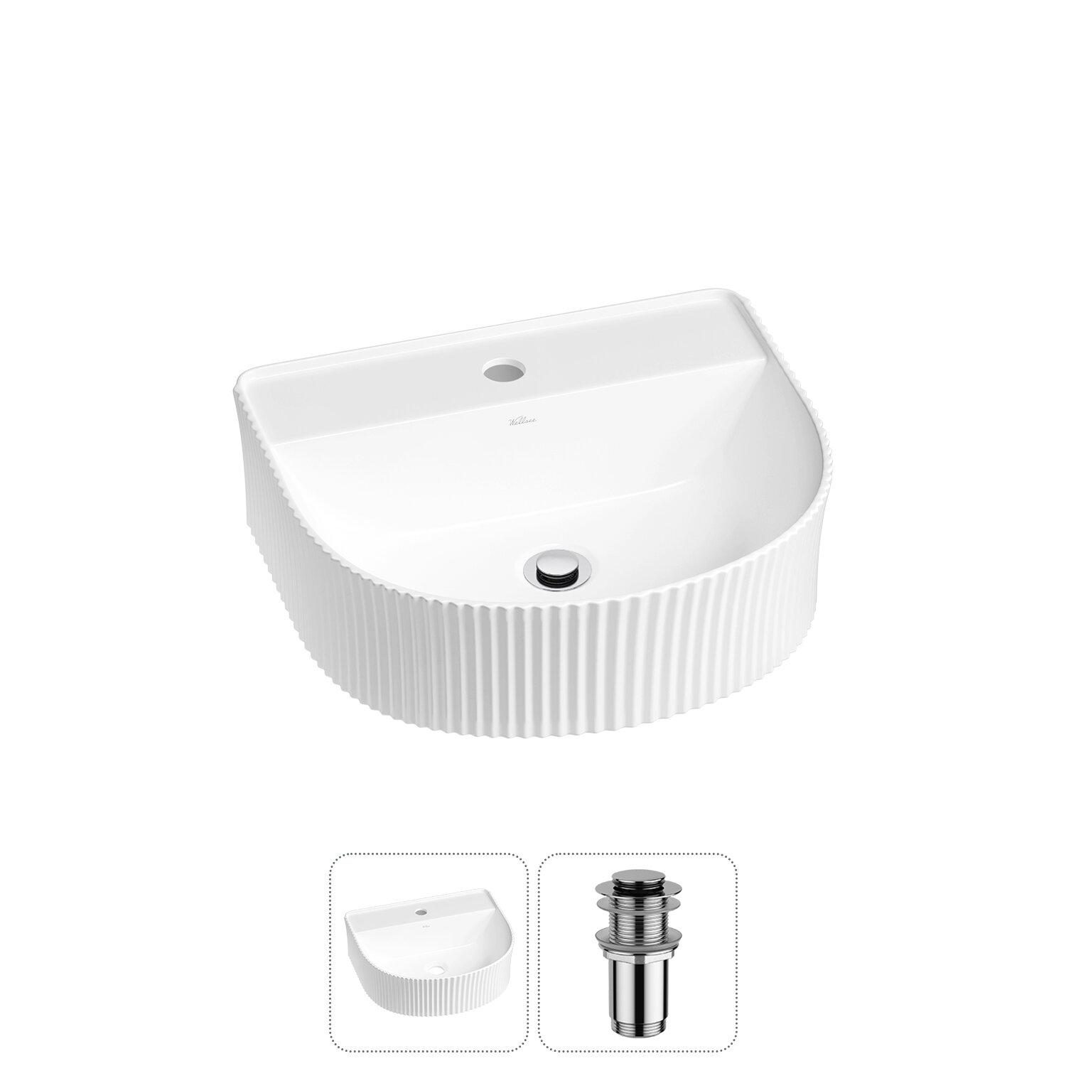 Подвесная или накладная раковина в ванную комнату Wellsee Festive Fox 20213438R в наборе 3 в 1: раковина 45 см в цвете белый глянец, донный клапан, сифон (цвет набора хром)