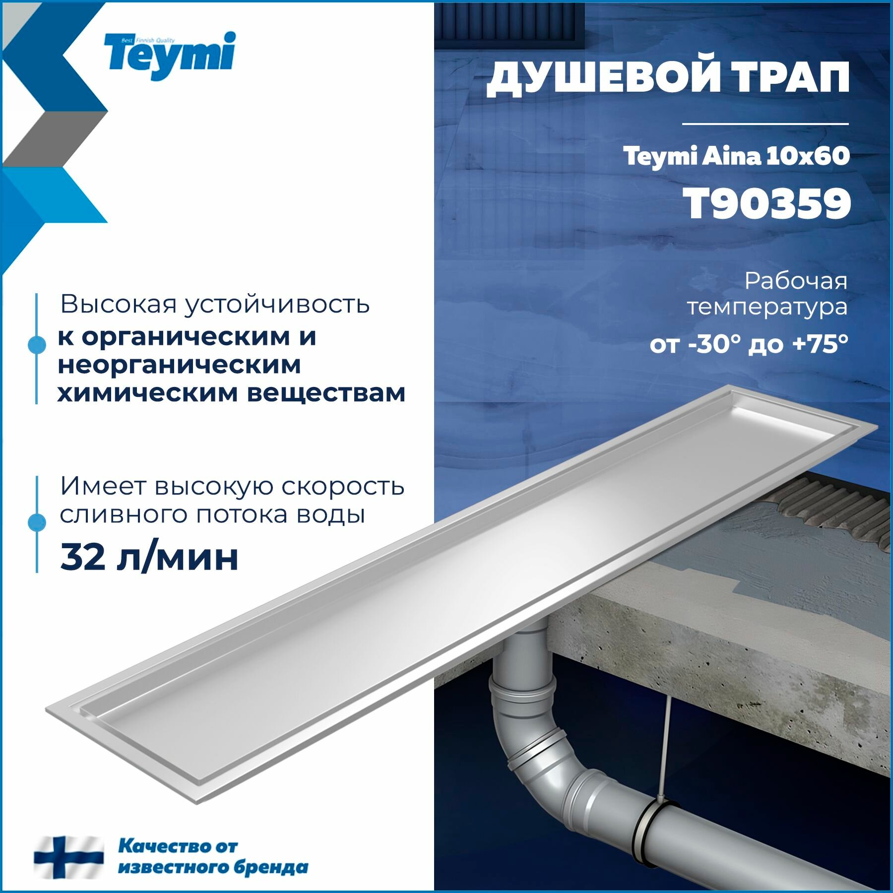 Купить Трап для душа под плитку с сухим затвором вертикальный выпуск Teymi Aina 10х60 нержавеющая сталь T90359