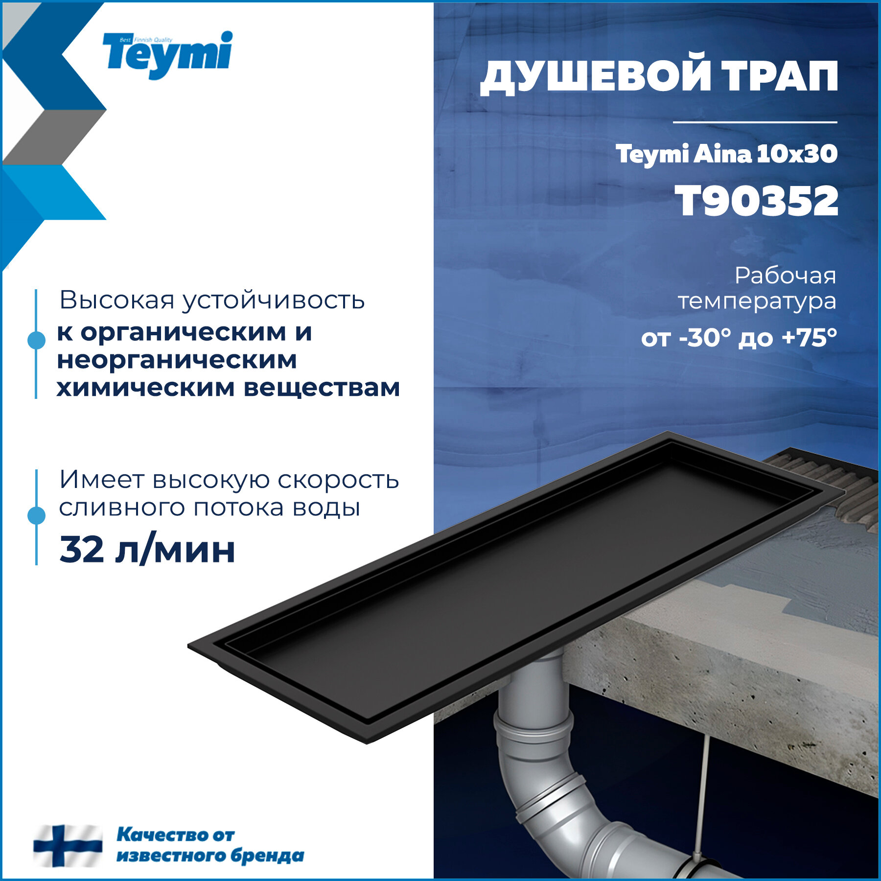 Купить Трап для душа под плитку с сухим затвором вертикальный выпуск Teymi Aina 10х30 черный T90352