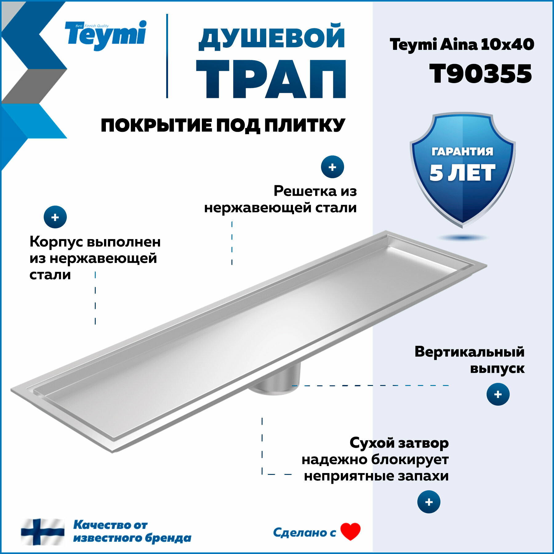 СохранитьТрап для душа под плитку с сухим затвором вертикальный выпуск Teymi Aina 10х40 нержавеющая сталь T90355 интересное: