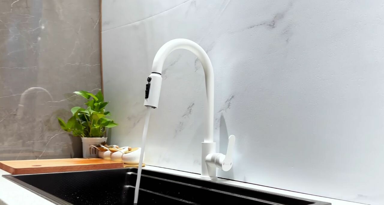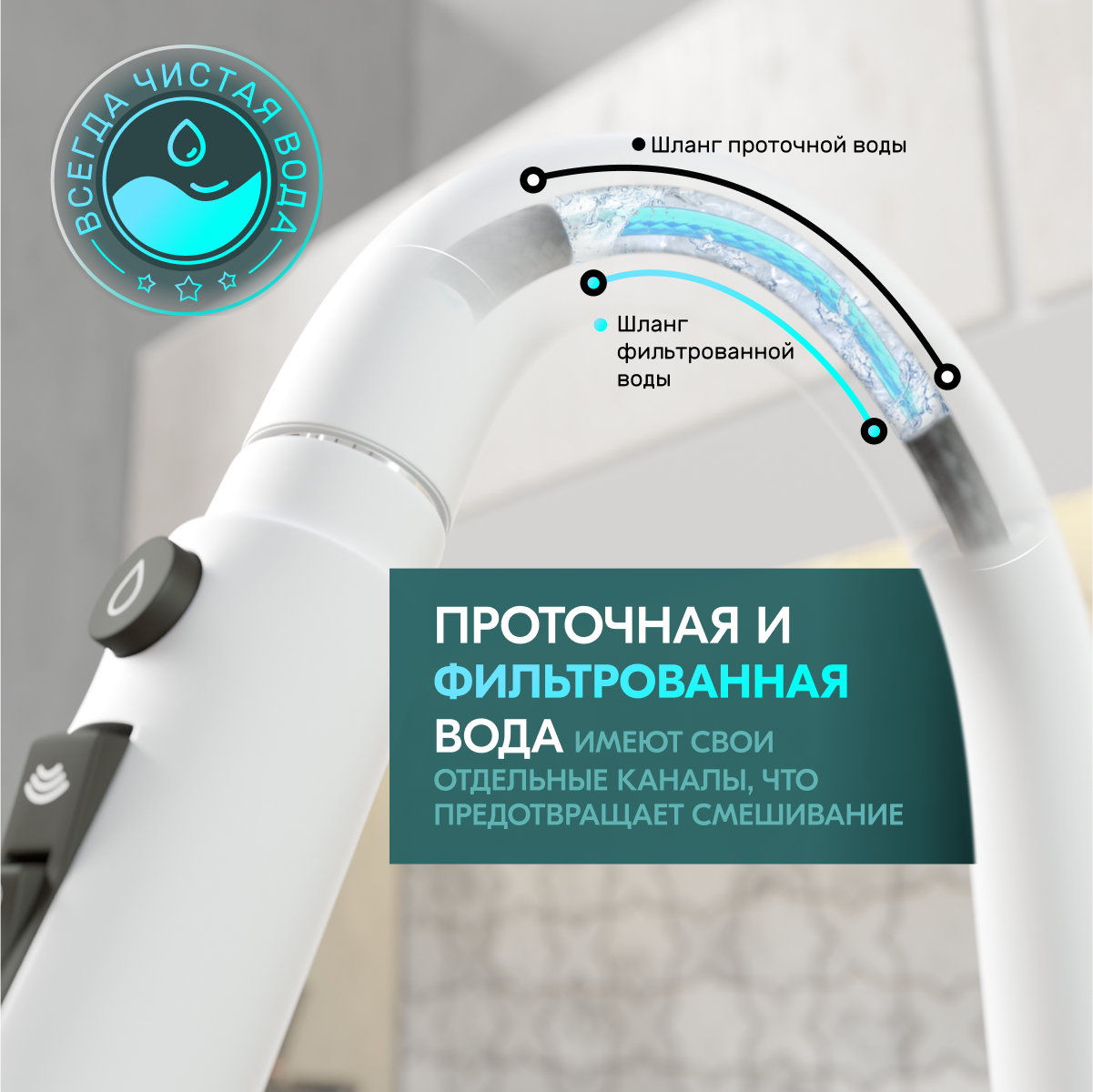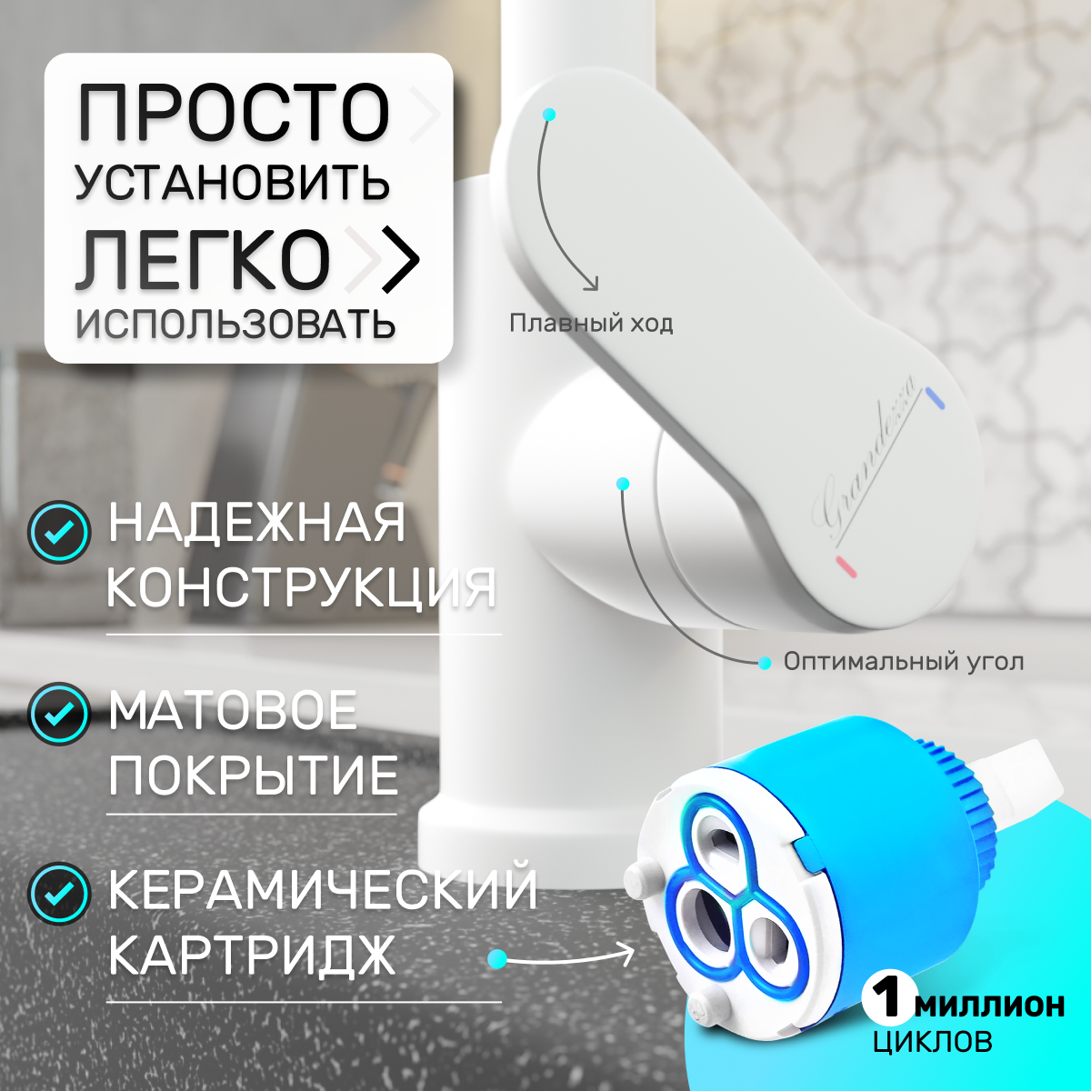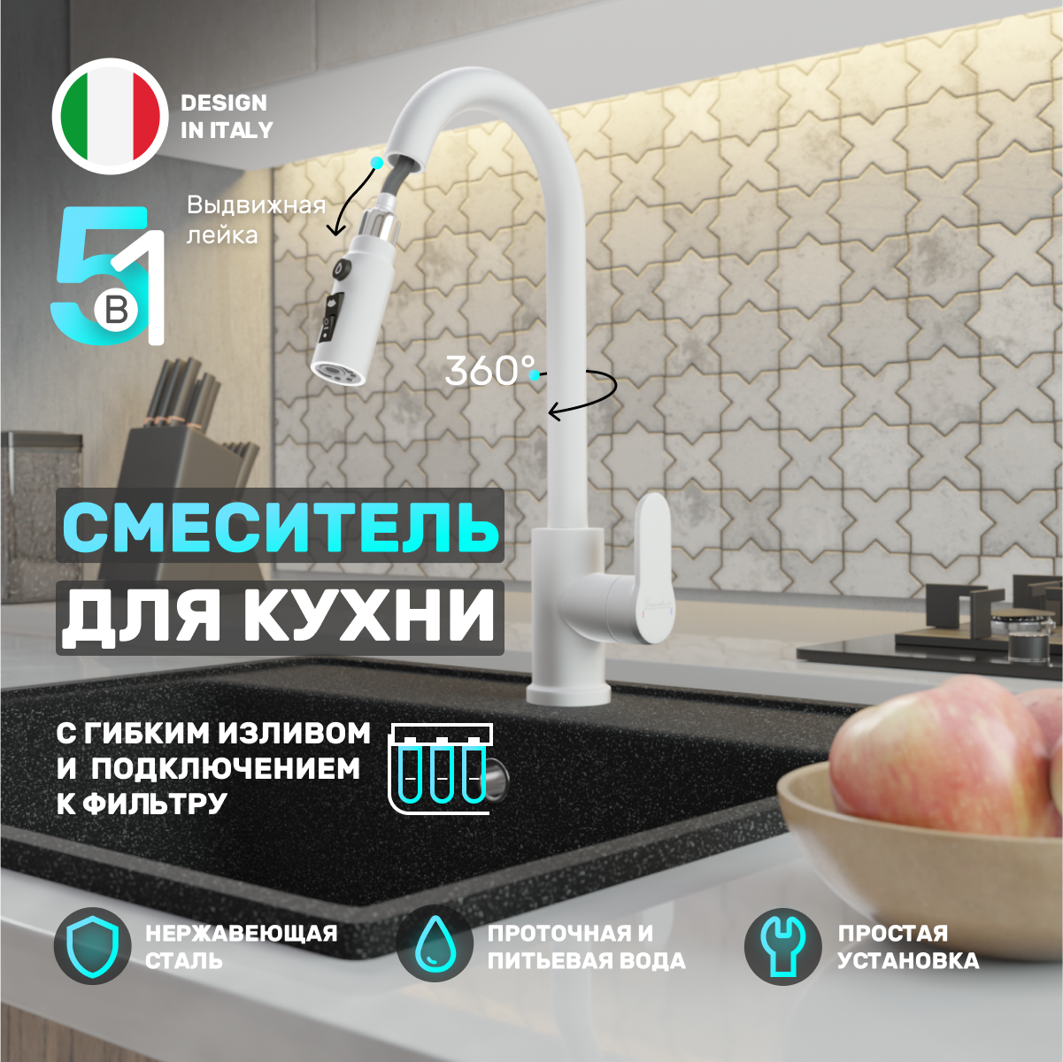 Смеситель для кухни с выдвижной лейкой Grandezza Segreto White ML24W подключением фильтра питьевой воды (Белый) интересное: