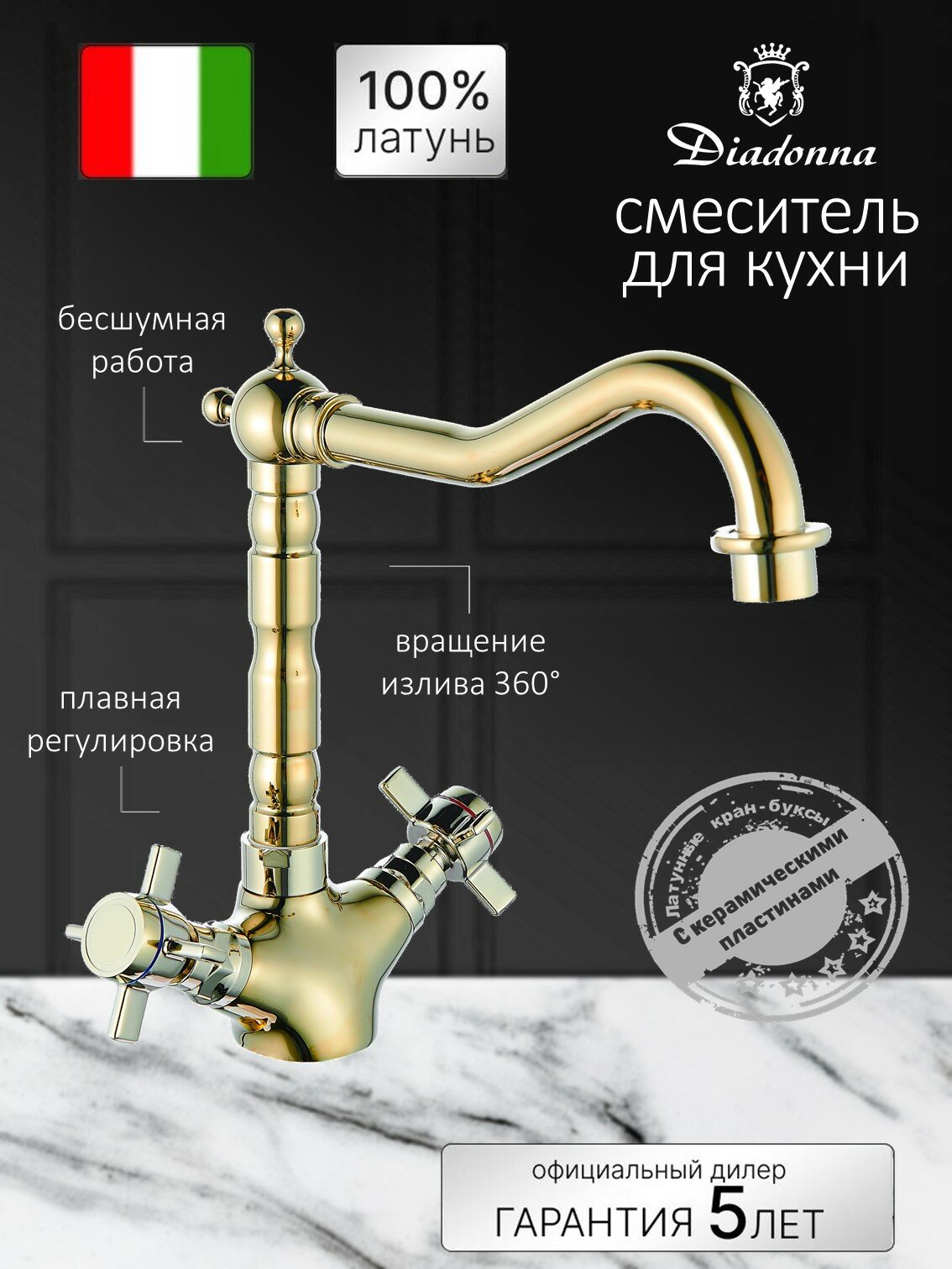 Смеситель на кухню Diadonna D84-754352J с высоким изливом, керамические кран-буксы, золото, крепление гайка интересное: