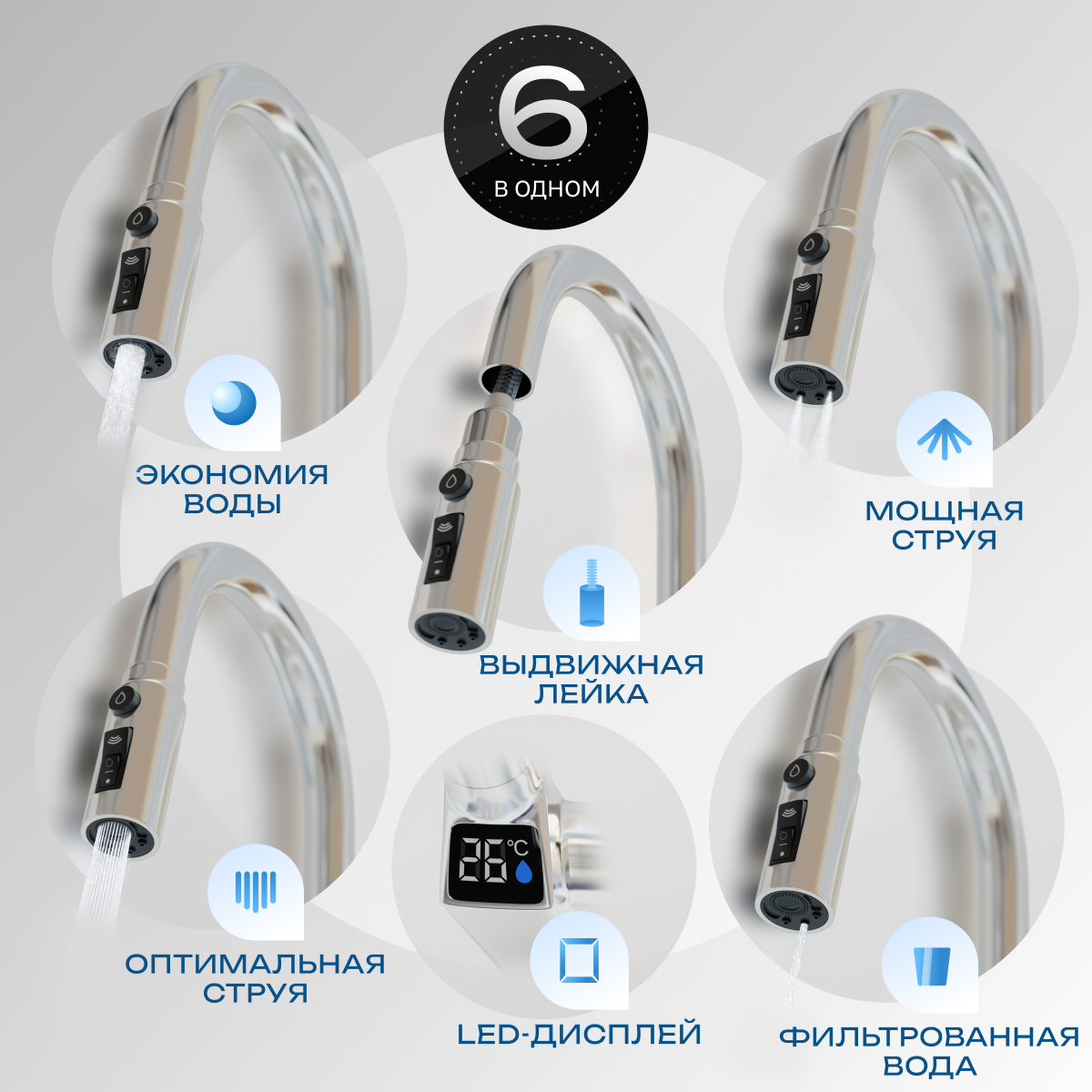 Смеситель для кухни с выдвижной лейкой Grandezza Segreto Chrome SC23 подключением фильтра питьевой воды и Led дисплеем (Хром) интересное: