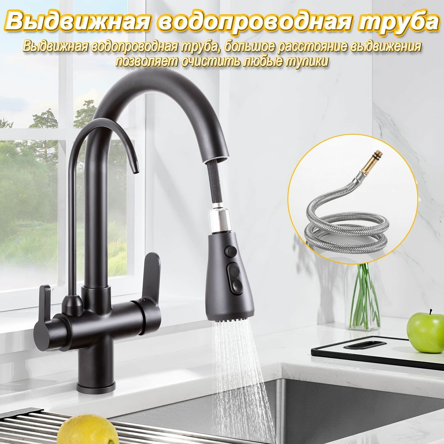 Смеситель для кухни, с фильтром для питьевой воды, кран для кухни, 2 в 1, ванны, раковины в ванную, 320MM, черный