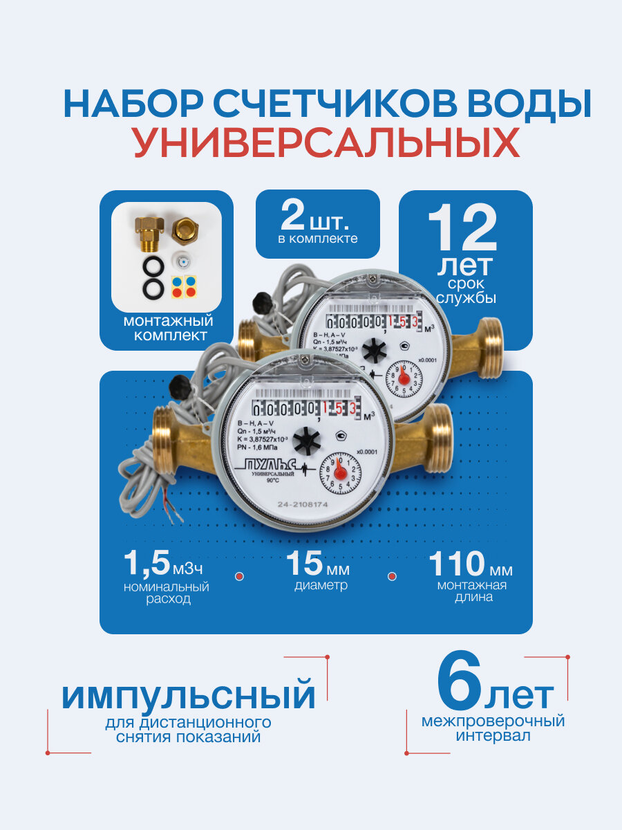 Набор счетчиков воды 15УИ-110, 2 шт. универсальный с КМЧ. интересное: