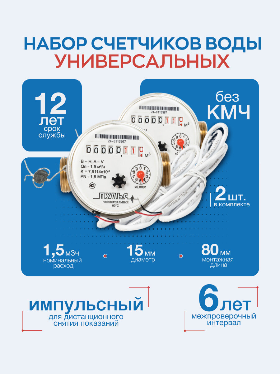 Набор счетчиков воды 15УИ-80, 2 шт. универсальный, без КМЧ. интересное: