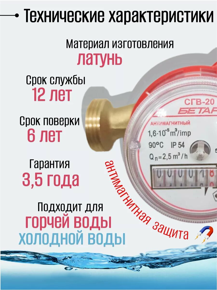 Счетчик воды СГВ 20 (130мм) Бетар Универсальный Антимагнитный с Комплектом монтажных частей интересное: