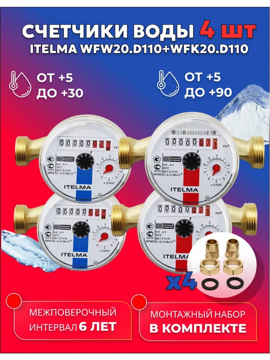 Счетчики воды ITELMA 110мм Комплект 4 шт с комплектом монтажных частей интересное: