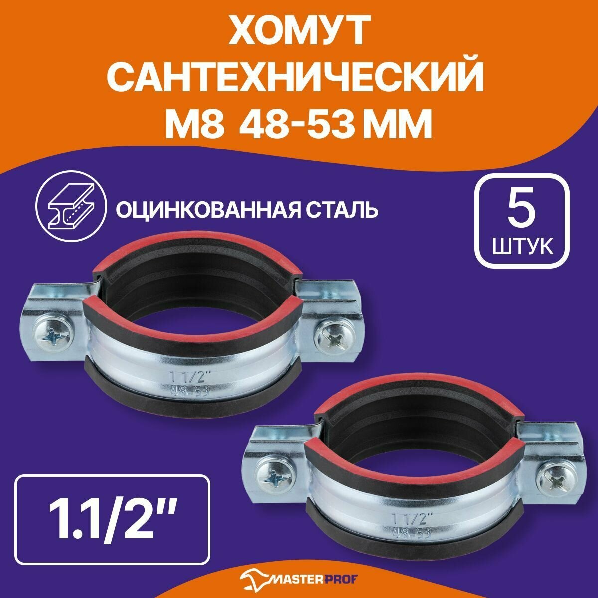 Купить Хомут сантехнический 5 шт. 1.1/2" (48-53 мм) М8 оцинкованный, с резиновым уплотнителем, с шурупом и дюбелем