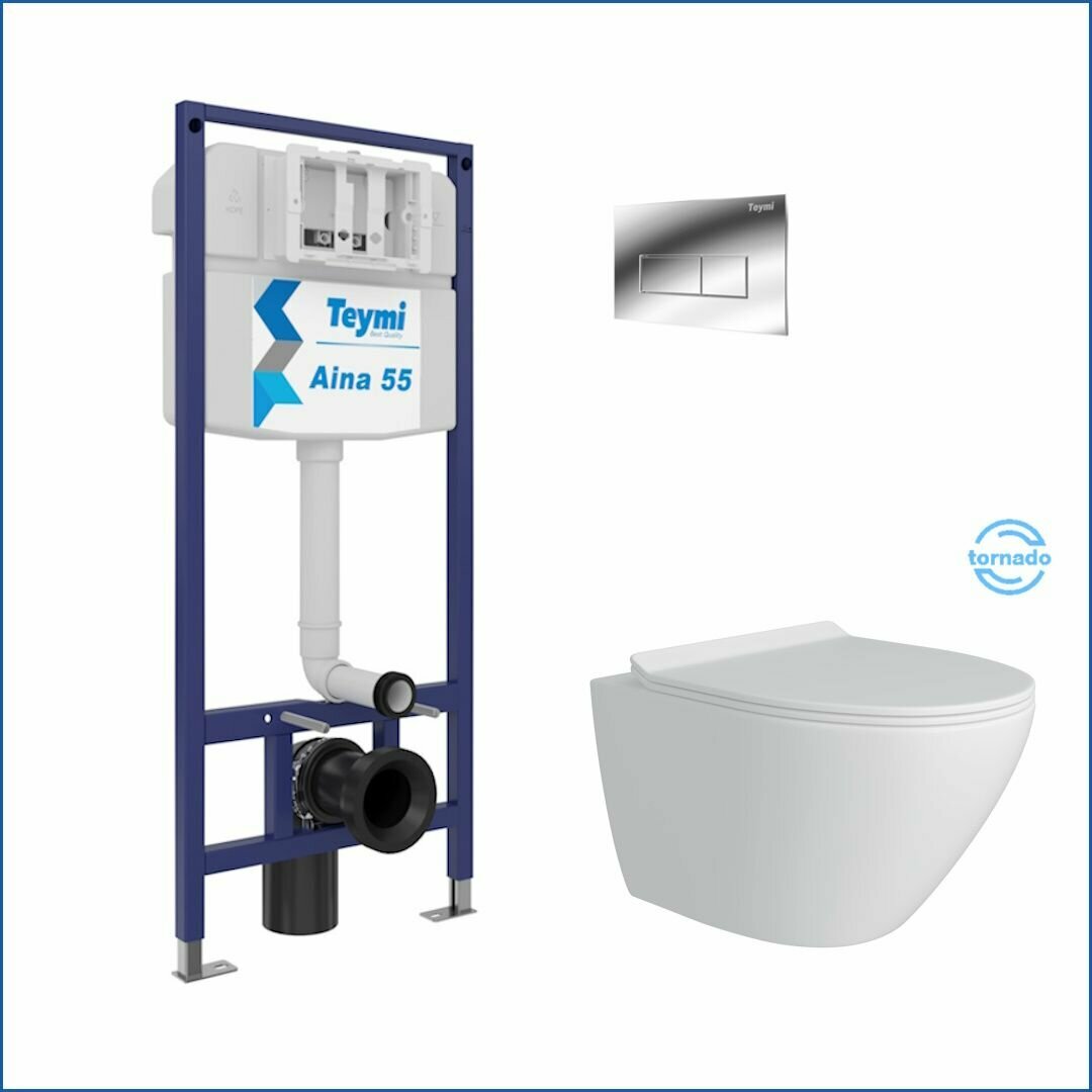 Инсталляция с унитазом комплект 5 в 1 Teymi унитаз подвесной безободковый торнадо Lina Pro Vortex кнопка хром F14508